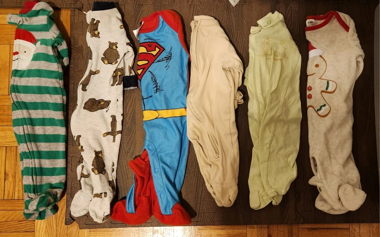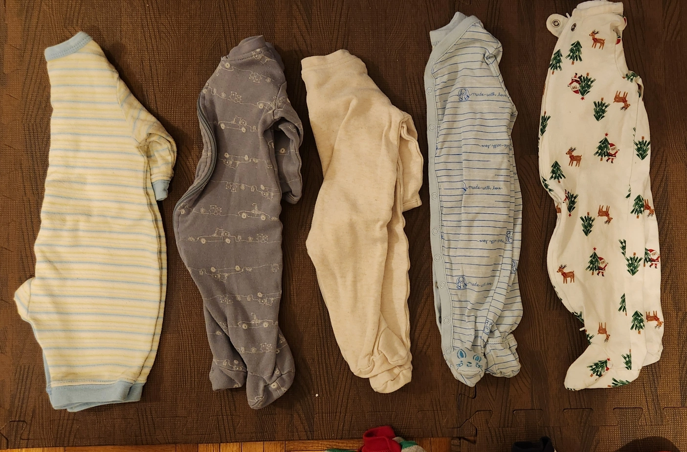 Eleven adorable baby sleepers. Various colours and patterns. 0-3 months.. Good used condition.