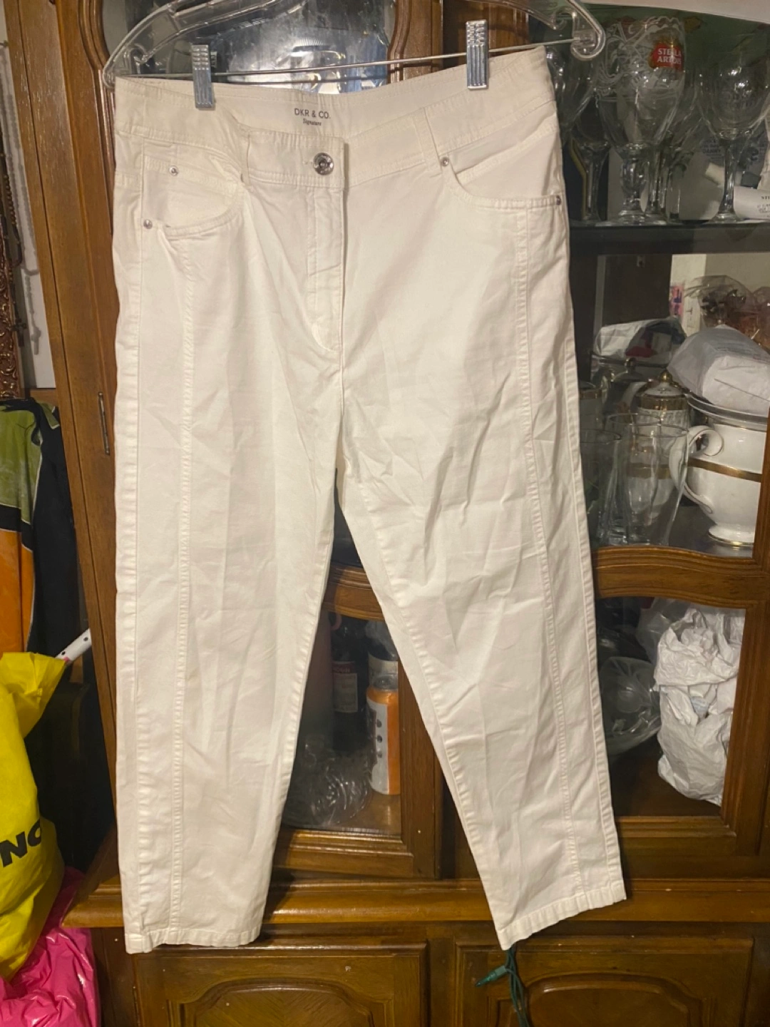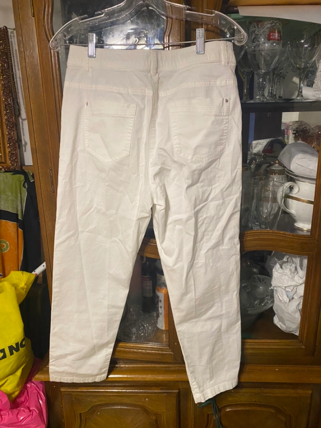 Women's cropped pants. Off-white colour. Five-pocket style. Side seams detail.