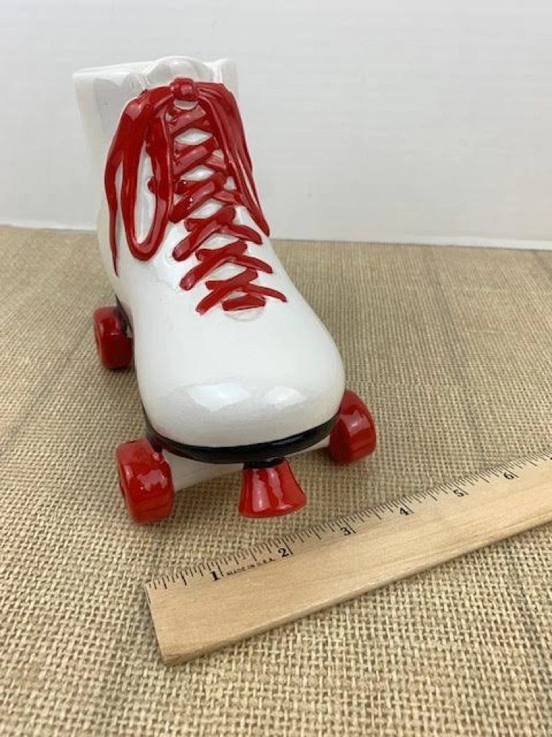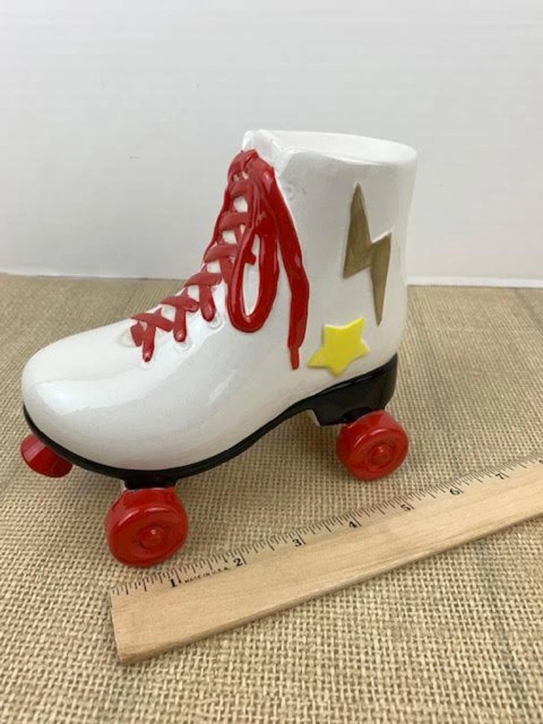 Rare find ,Adorable vintage ceramic roller skate piggy bank. White with red wheels and laces. Features a lightning bolt and star graphic. Great for collecting or display.