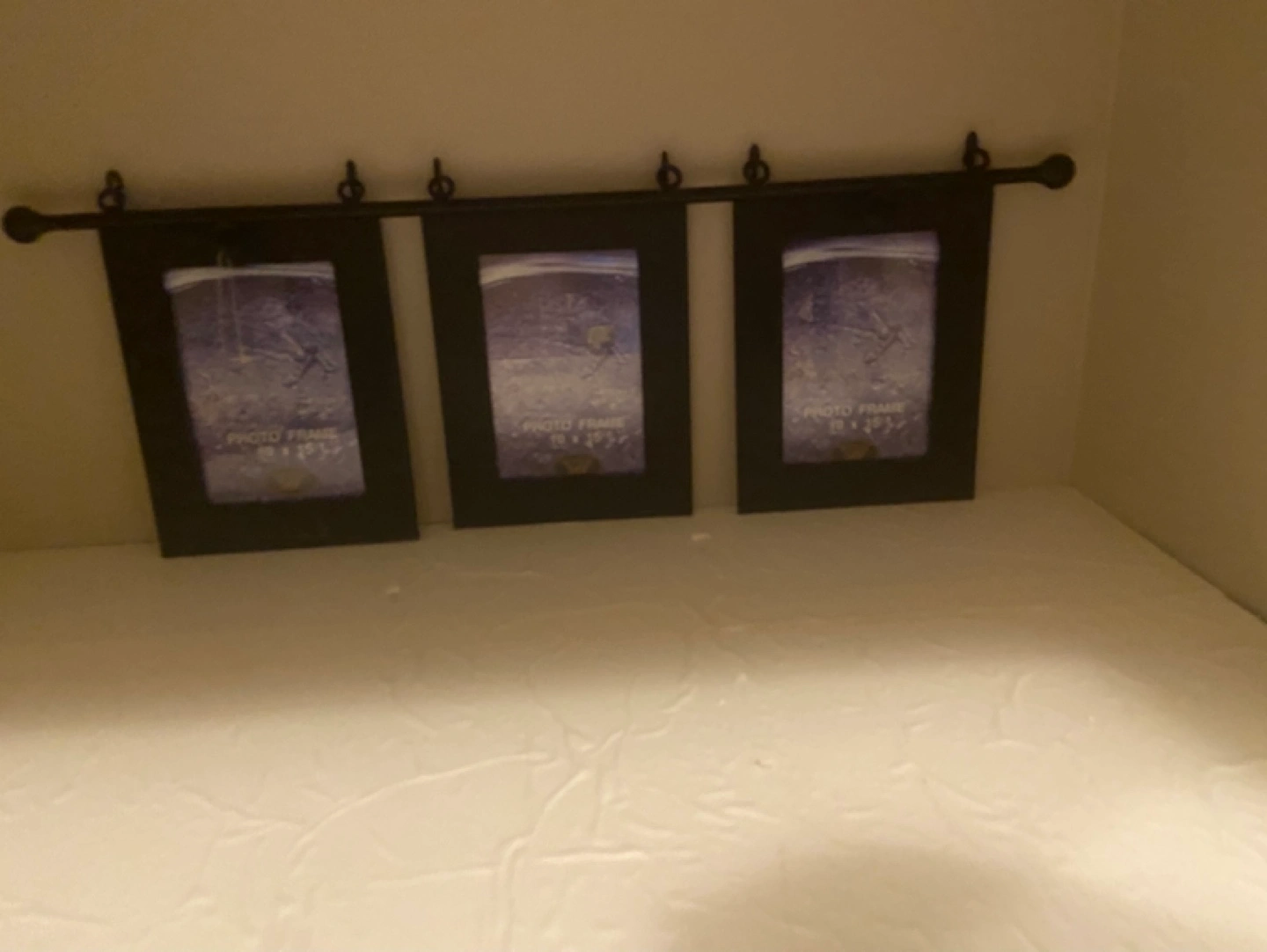 Three black photo frames attached to a hanging rail. Great for displaying photos. Simple and elegant design.