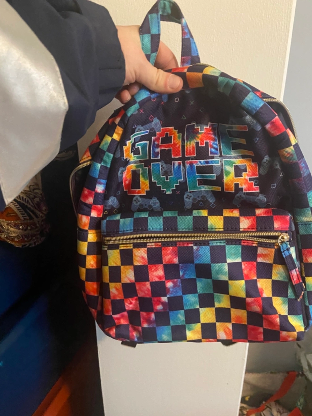 Lightly used condition never used Small backpack. Features a rainbow tie-dye checkered pattern and Game Over text. Gold zippers.