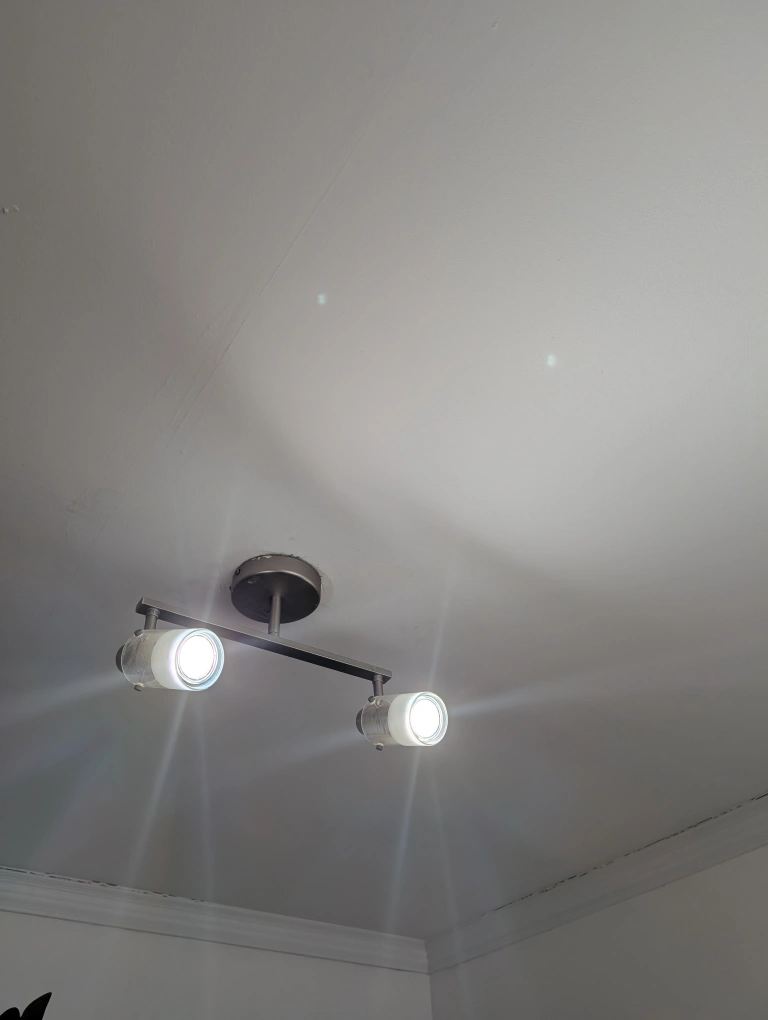 Modern brushed nickel finish. Two frosted glass shades. Adjustable spotlights. Easy installation. Great for hallways or bedrooms. Pre-owned, good condition.
