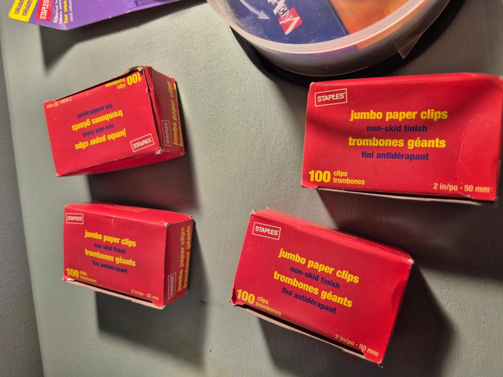 Bulk lot of office supplies. Includes three boxes of Staples jumbo paper clips, one pack of Verbatim DVD-R discs, and one roll of calculator tape. All new and unused. all for $5