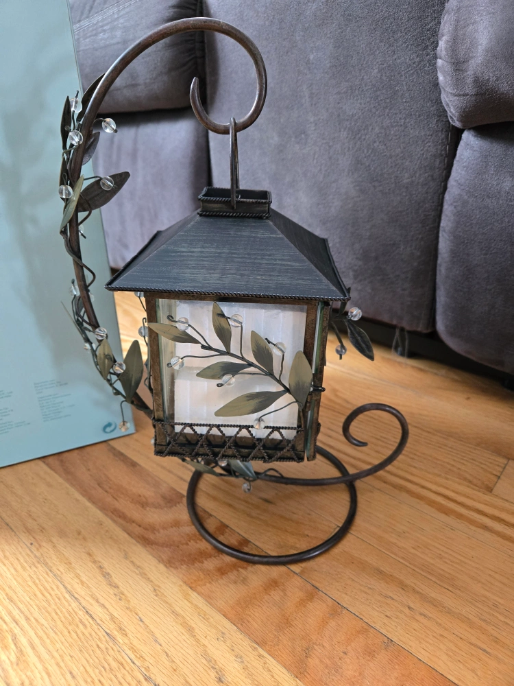 Ornate metal lantern. Features a decorative stand and leaf accents. Perfect for adding ambiance to your home or garden.