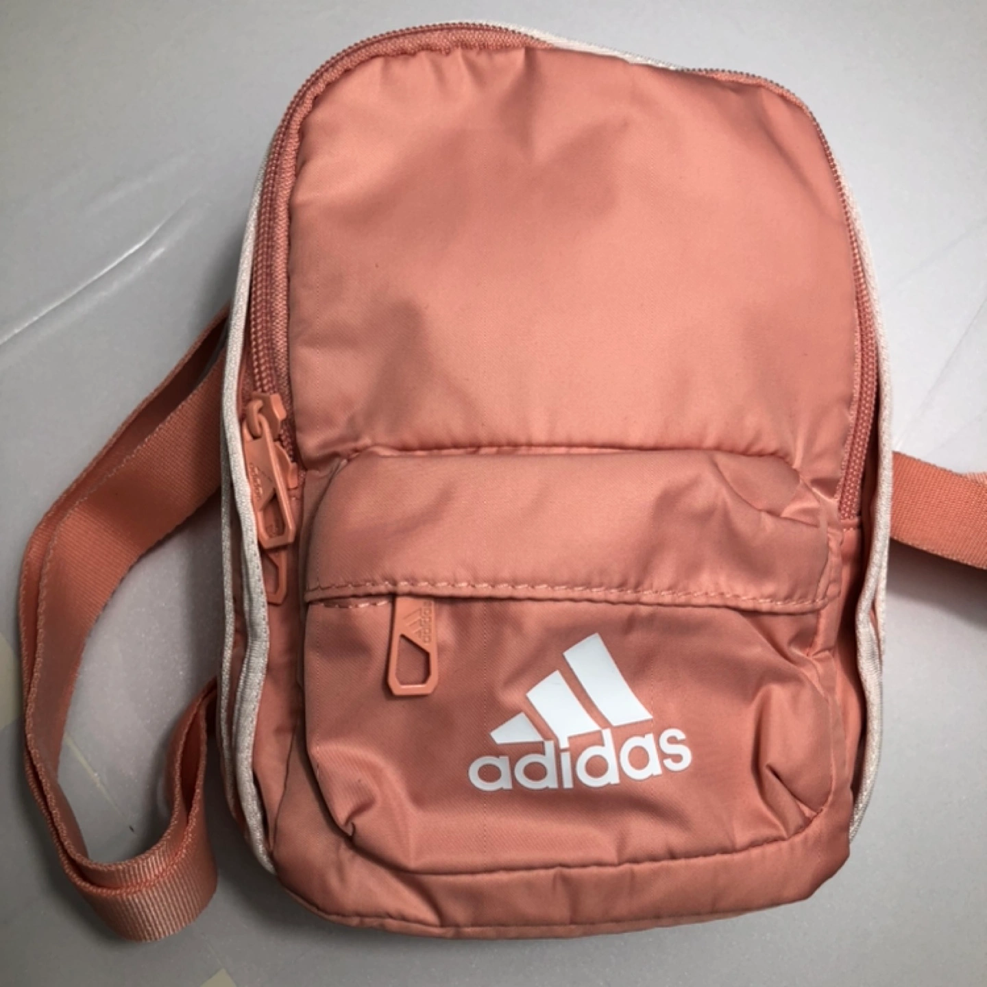 Pink Adidas mini nylon backpack. Features adjustable straps and a zipper closure. One zippered front pocket and one internal pocket. Perfect for everyday use or travel.