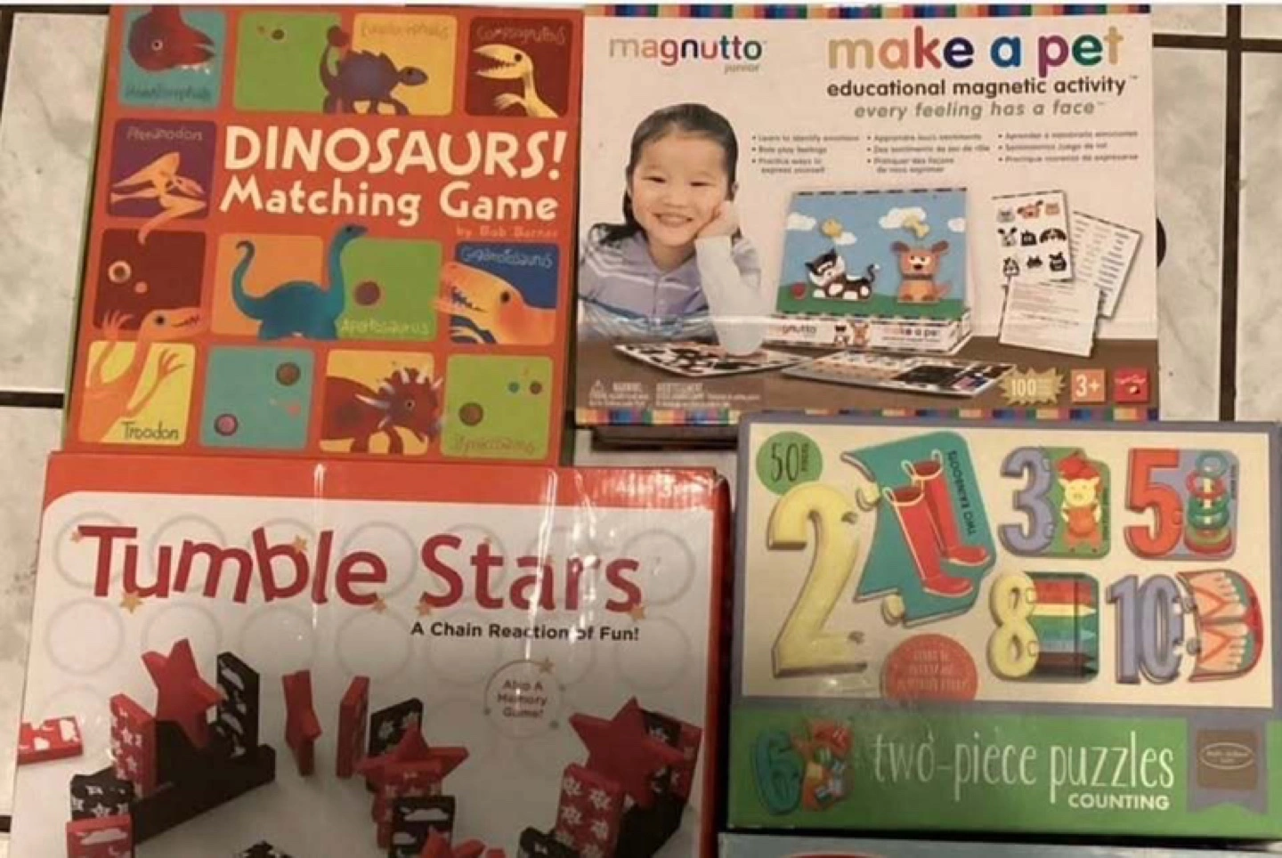 Set of four children's games. Includes dinosaur matching game, magnetic pet activity, tumble stars chain reaction game, and number puzzles. 1-2 pieces might be missing. Great for learning and fun!