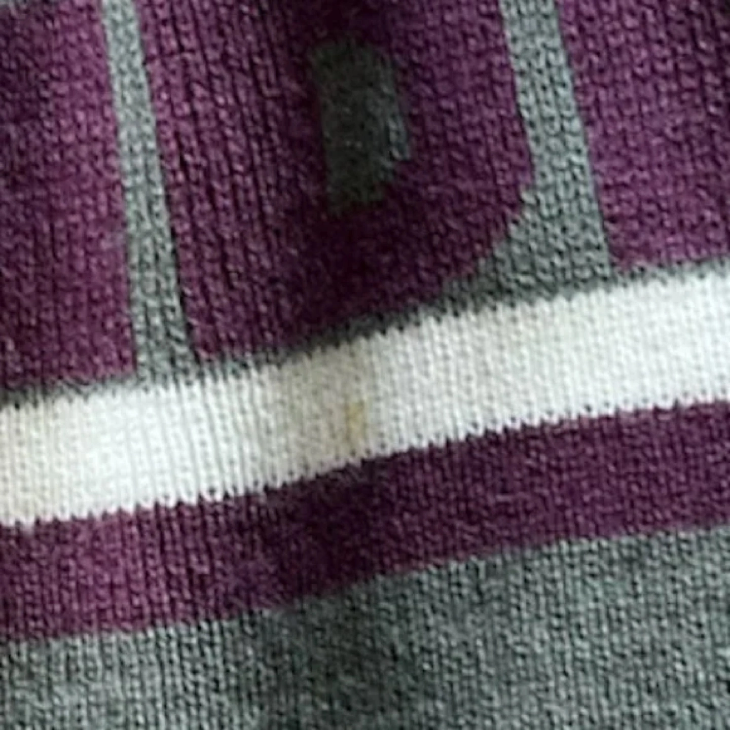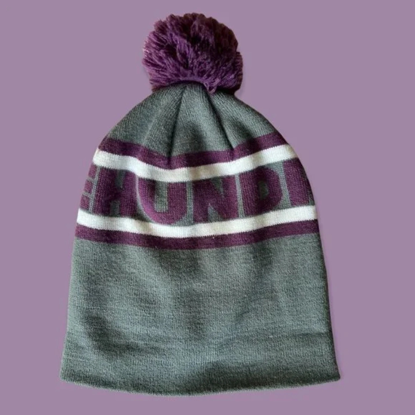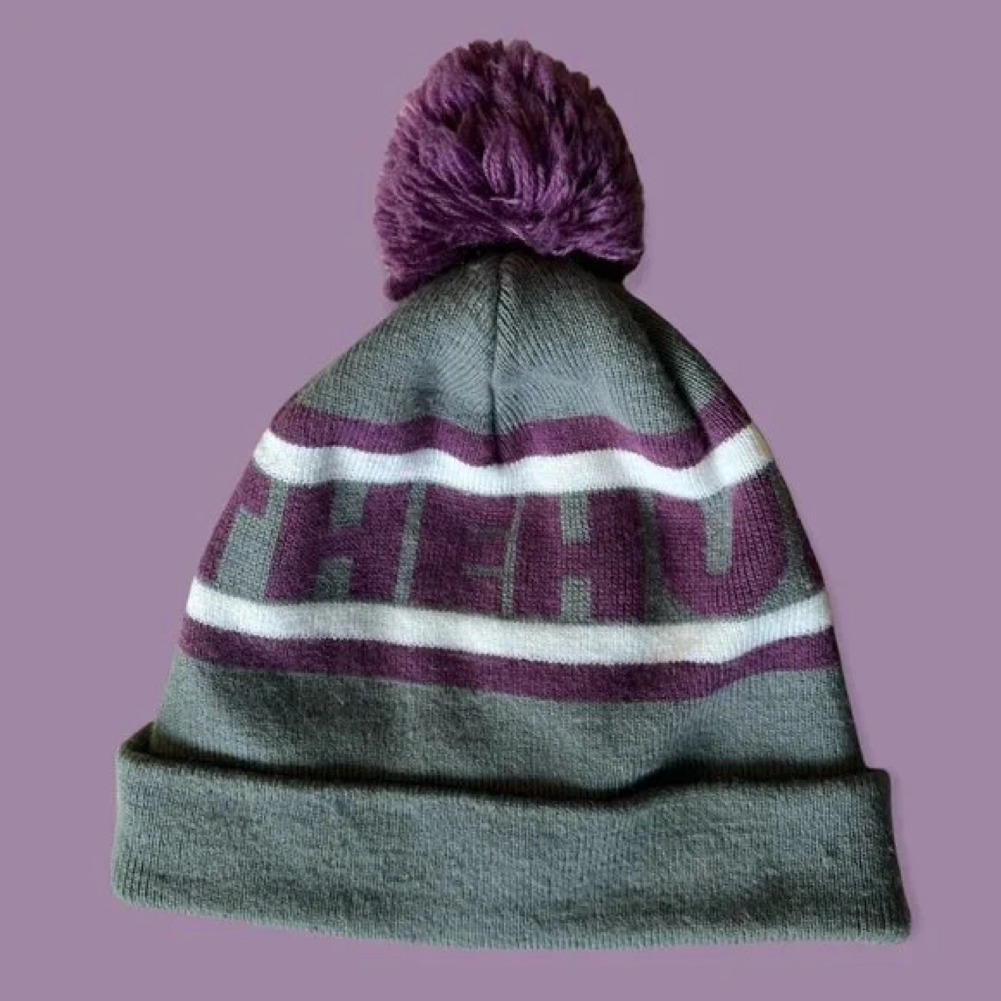 Grey and purple toque. Features a purple pom-pom. Knit material.