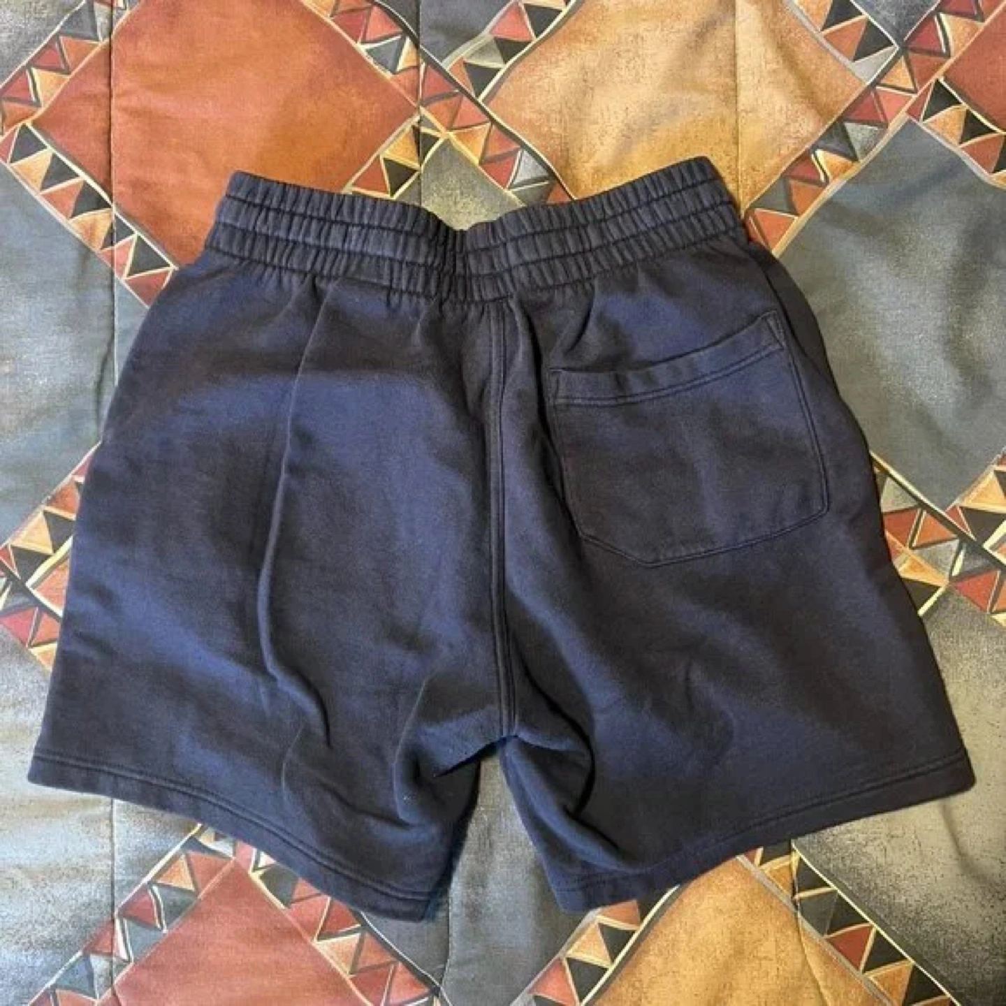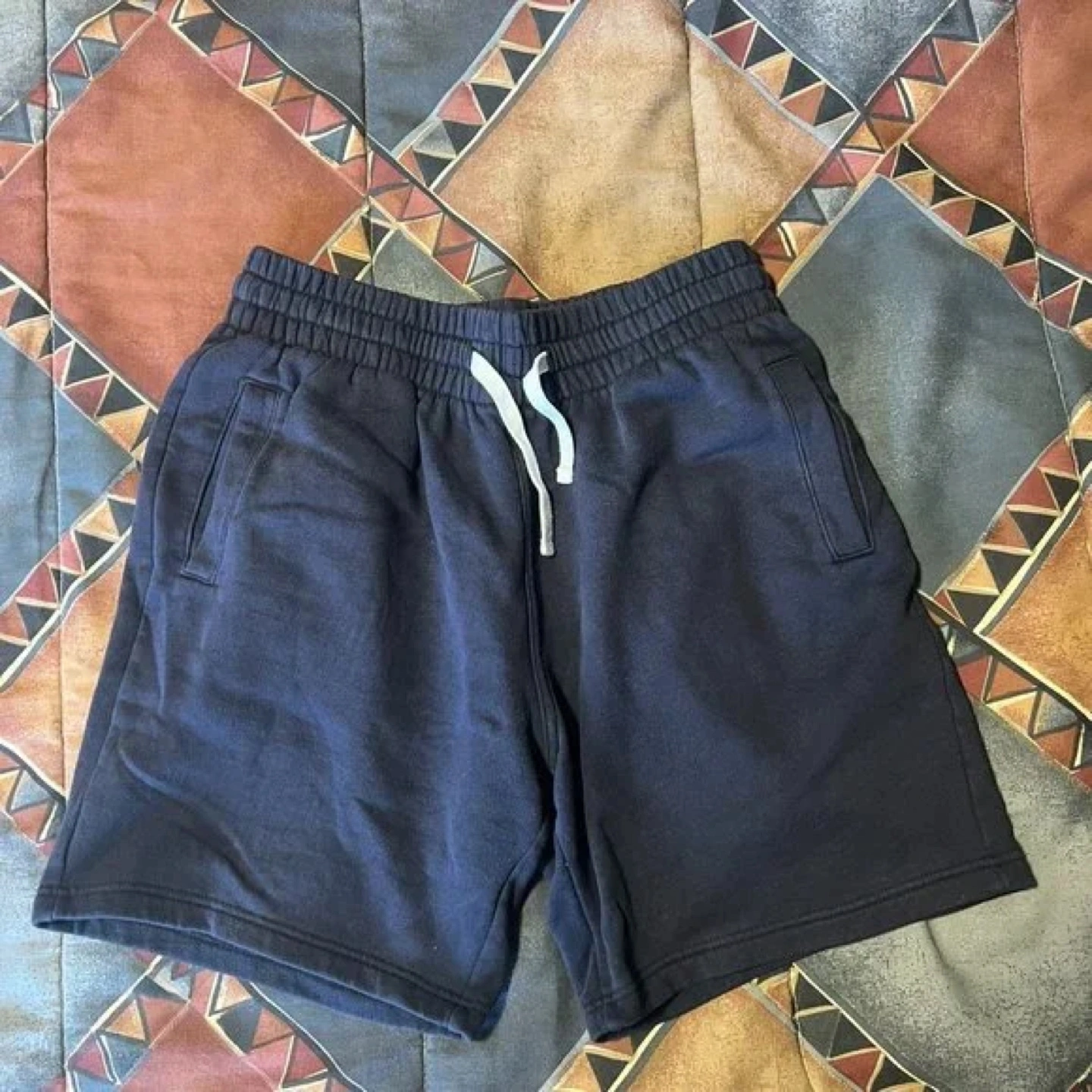 Dark navy blue men's shorts. Elastic waistband with drawstring. Side pockets. Comfortable fleece material. Great for lounging or working out.