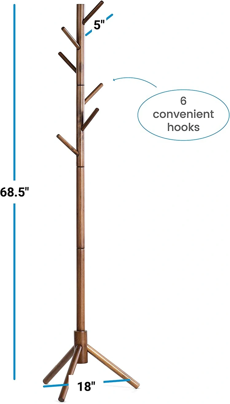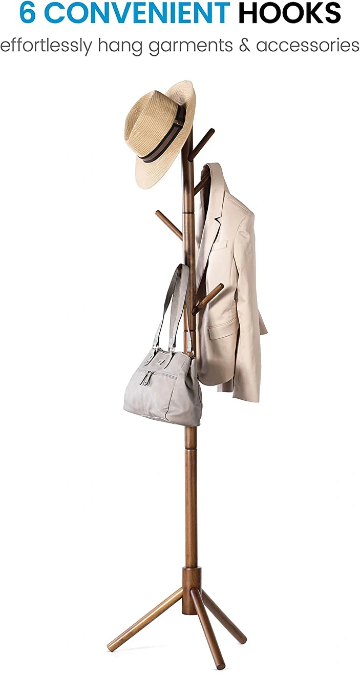Coat Rack - Standing, Wooden Clothing Rack with 6 Hooks