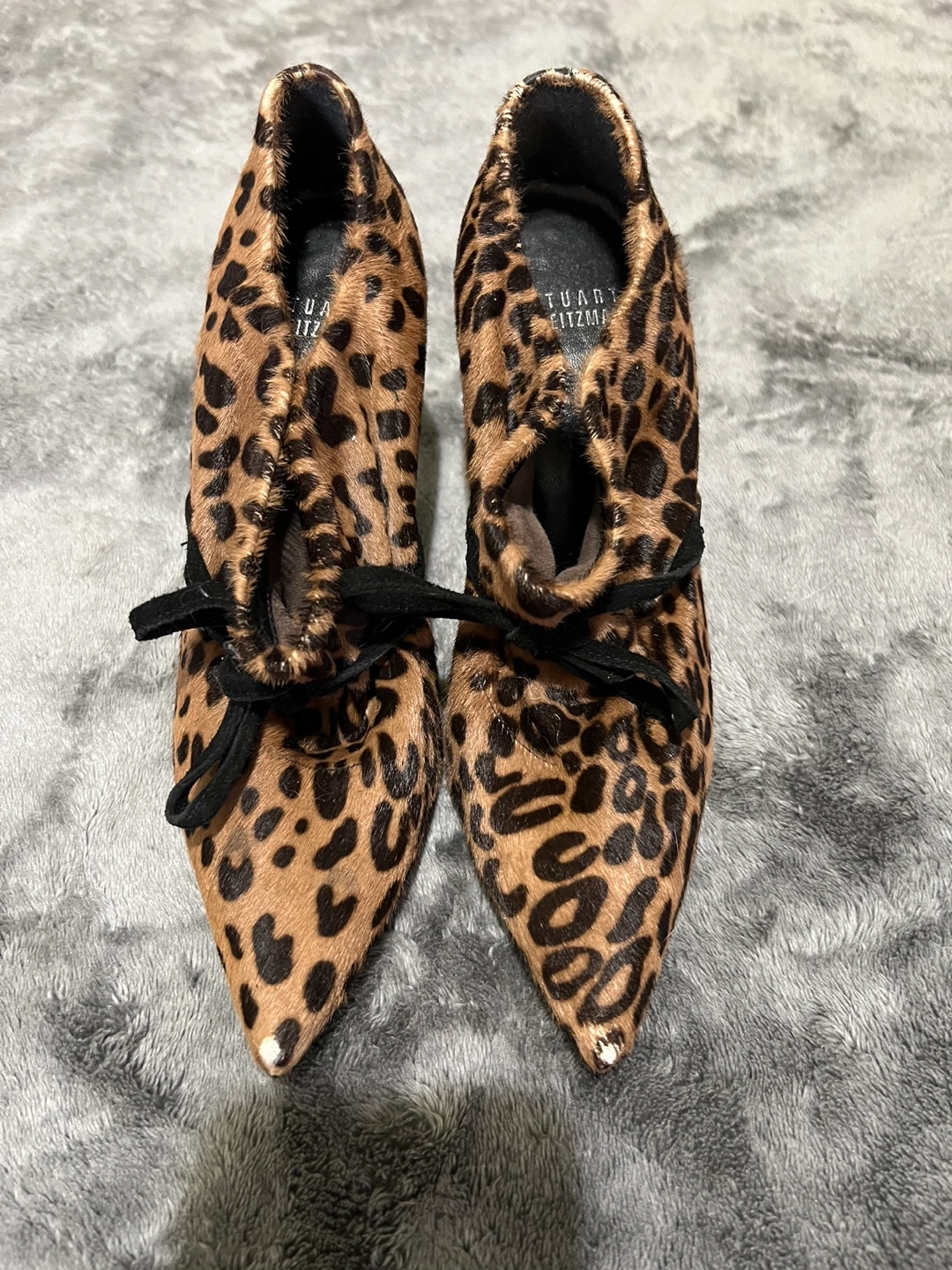 Women's leopard print calf suede Heel Bow booties. Pointed toe, stiletto heel. Lace-up detail at ankle.