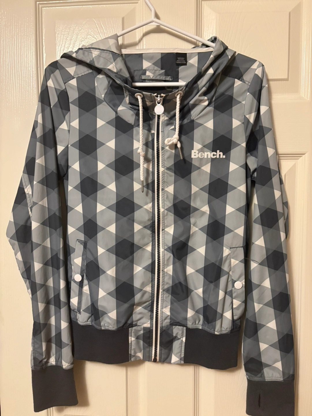 Lightweight hooded jacket. Zip-up front. Gray and white geometric pattern. Two pockets. Elastic waistband and cuffs. Like new condition, Pat and smoke-free home size small