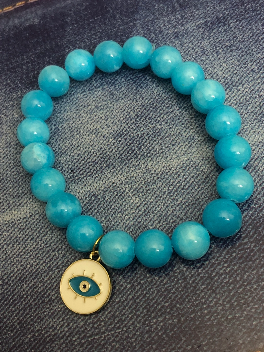 23Light blue beaded bracelet. Features a gold evil eye charm. Stretchy fit.Handmade