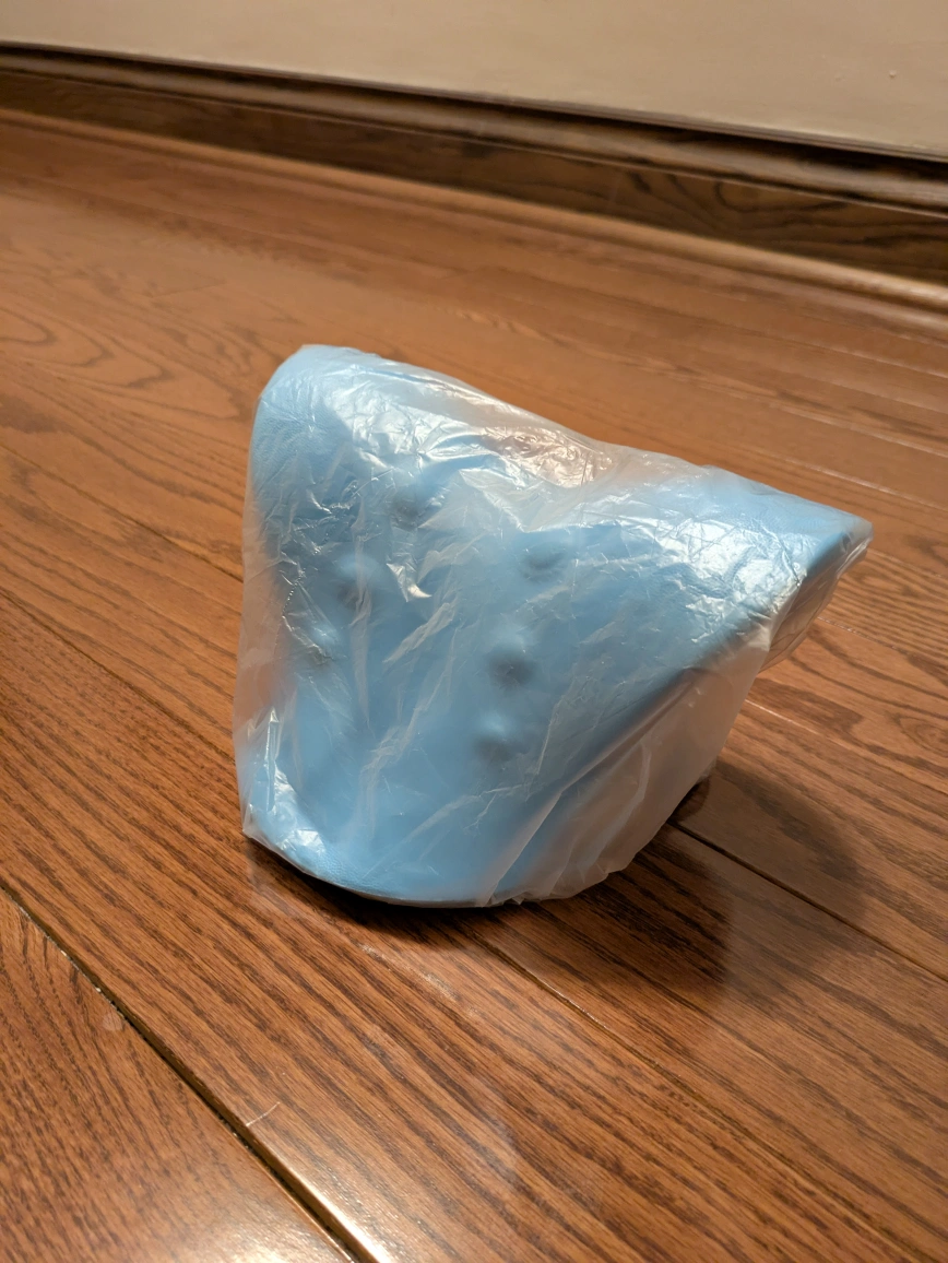 Unused neck stretcher. Features a unique curved design and textured surface. Perfect for relaxation and support. Durable plastic construction. Light blue colour.