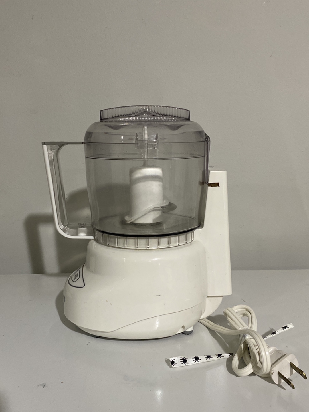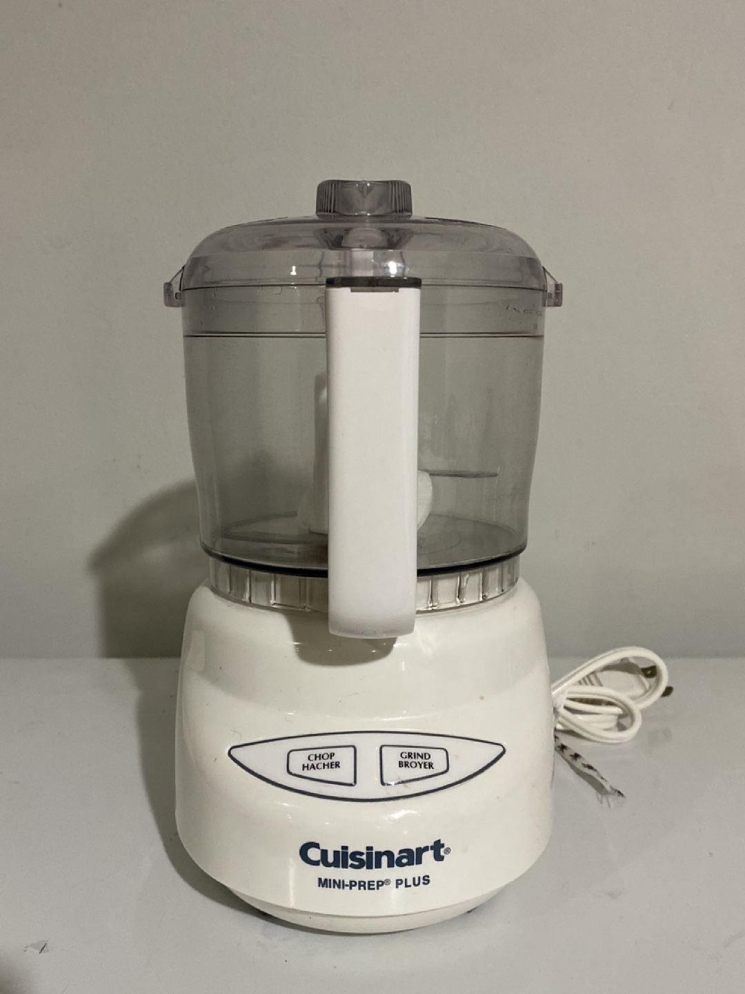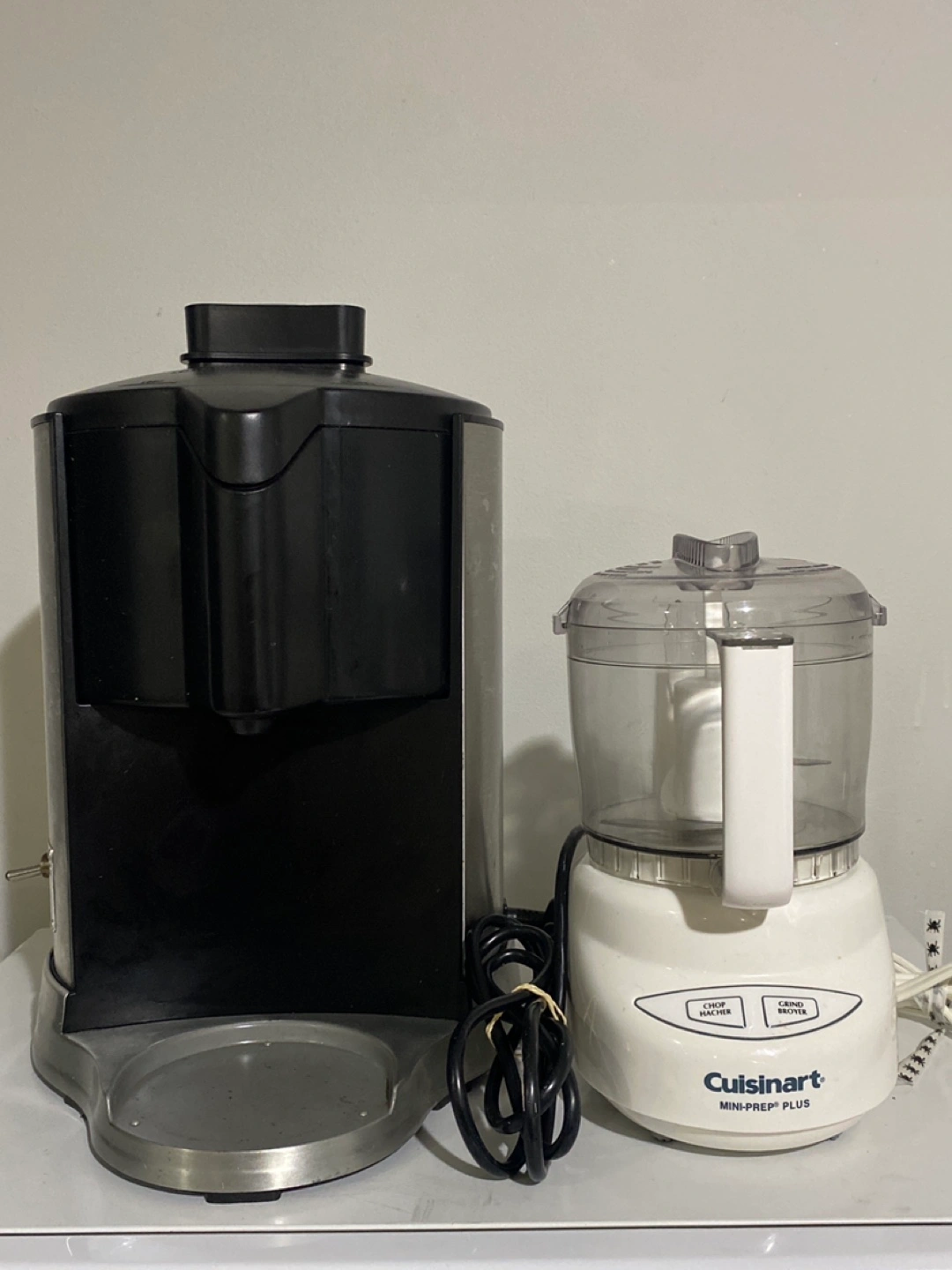Pair of kitchen appliances. Cuisinart Mini-Prep Plus food chopper, white, features chop and grind settings. Warner Health Juice Extractor, mostly stainless steel, with black accents. Both include power cords.