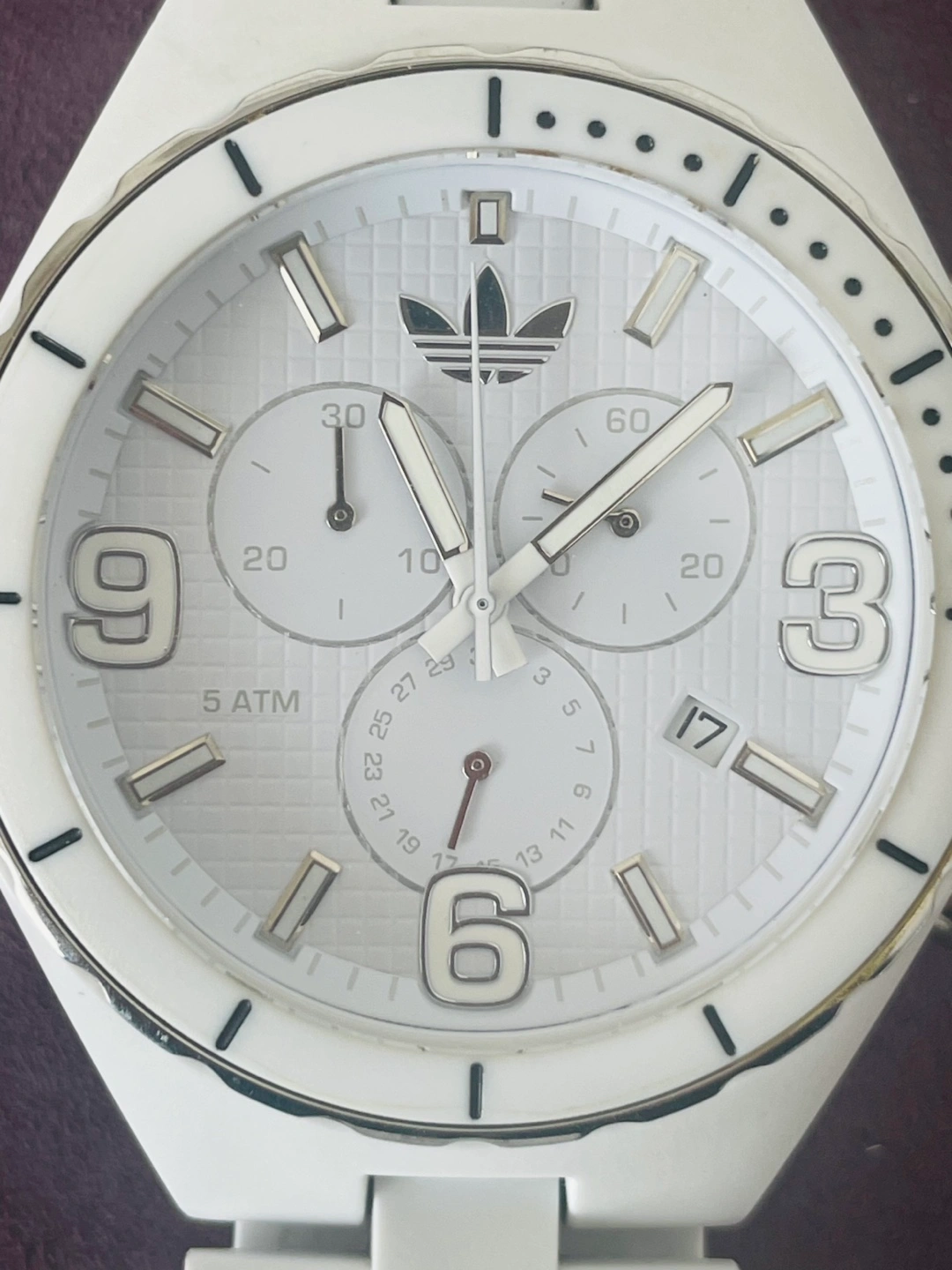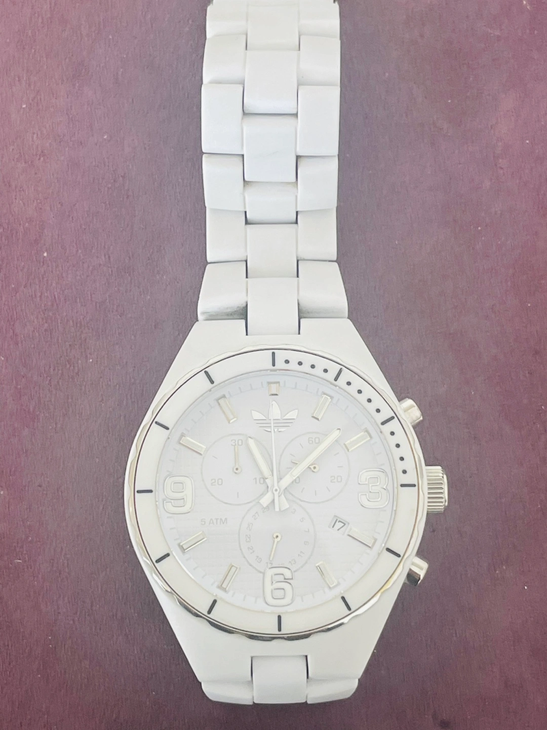 Men's Adidas watch. White ceramic band and face. Chronograph features. Includes extra links. 5 ATM water resistant.