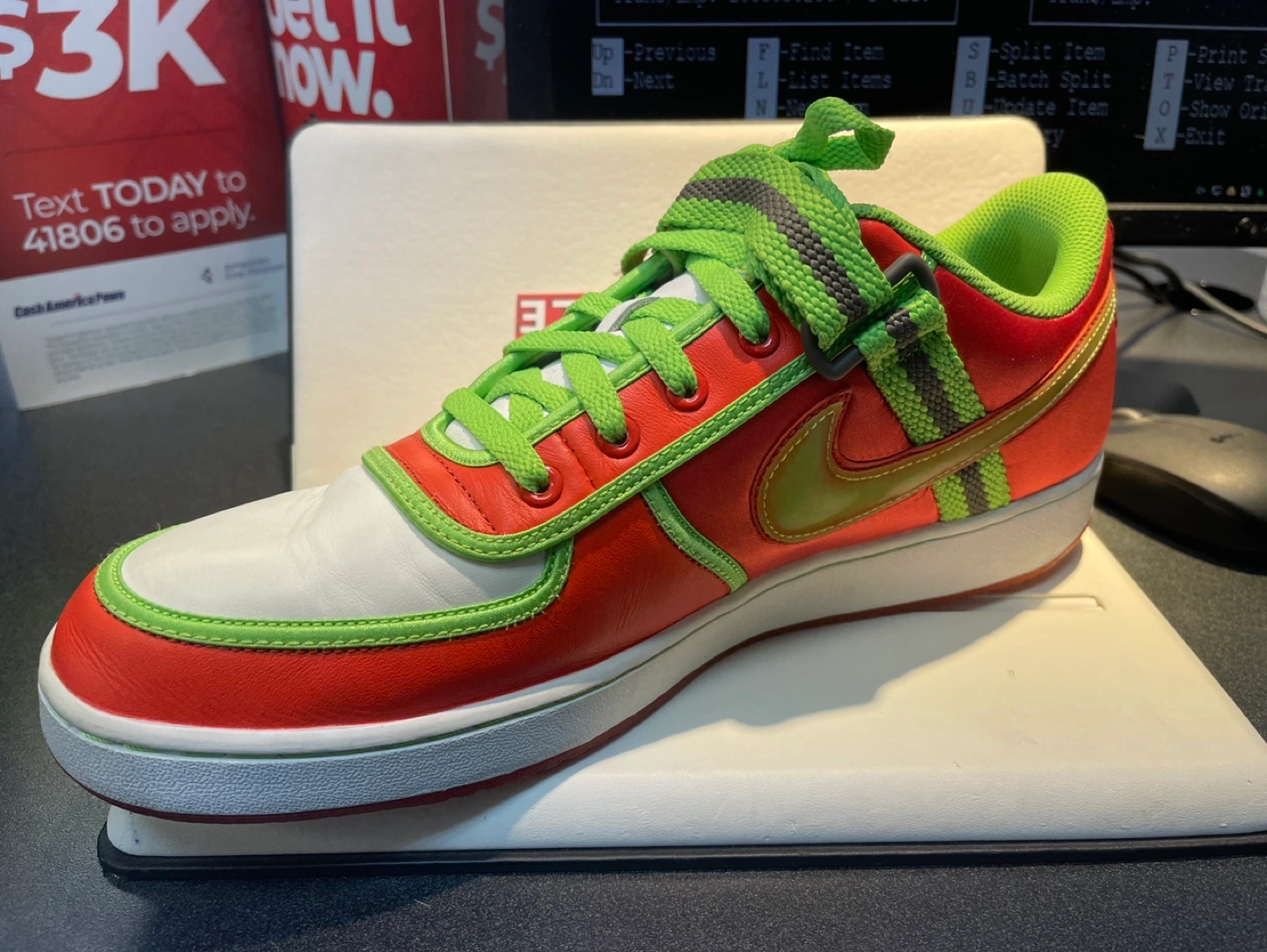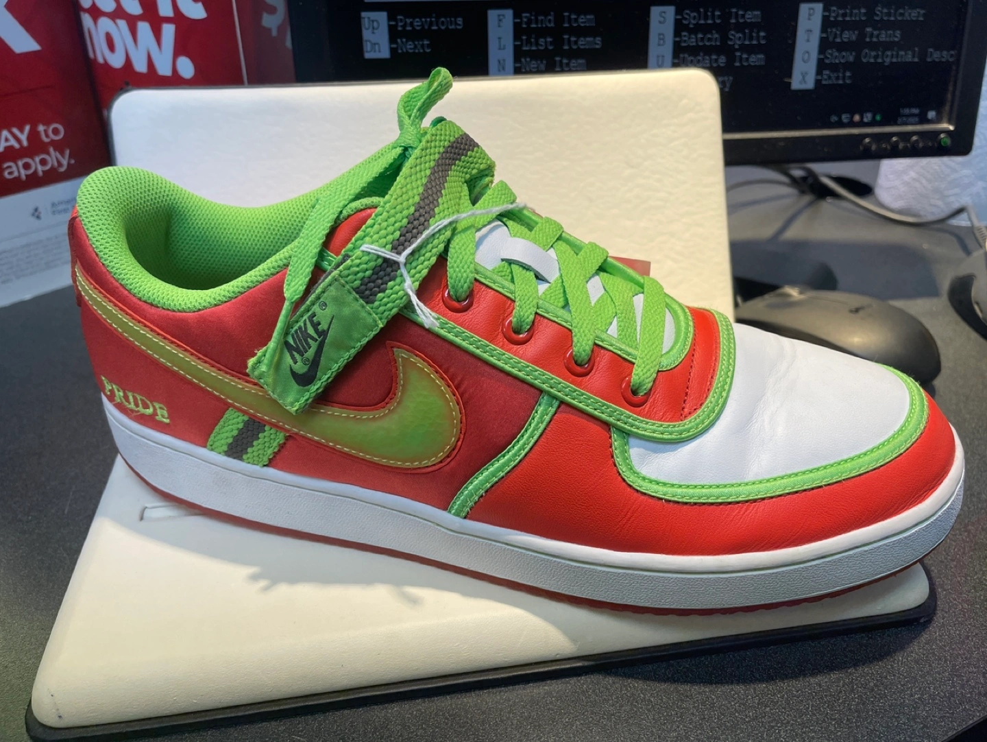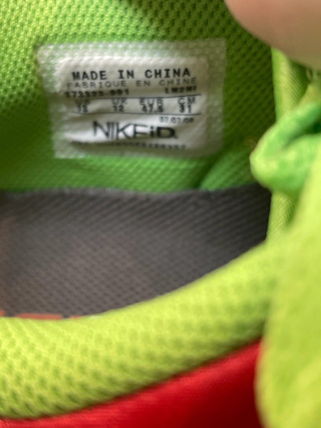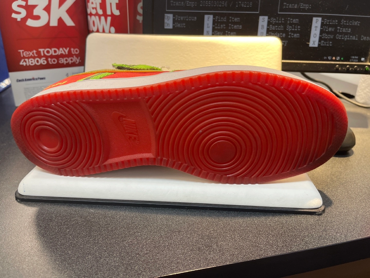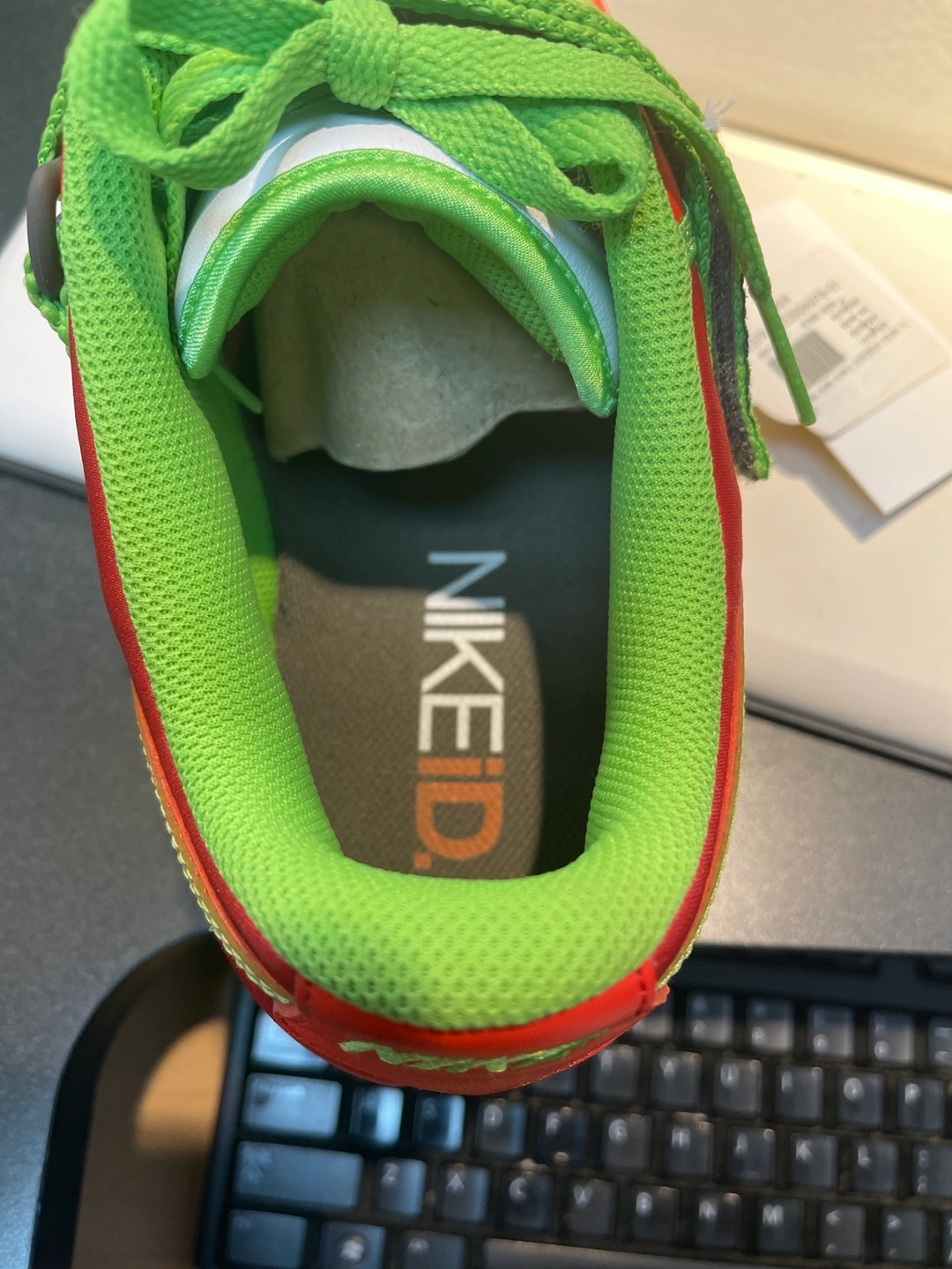 Custom Nike Air Force 1 iD sneakers. Red, green, and white colorway. Features Nike iD branding. Great condition