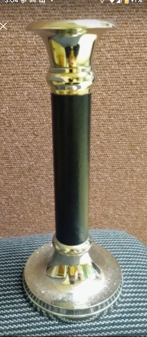 342One chrome and black faux leather candlestick /holder approximately 10 inches high.