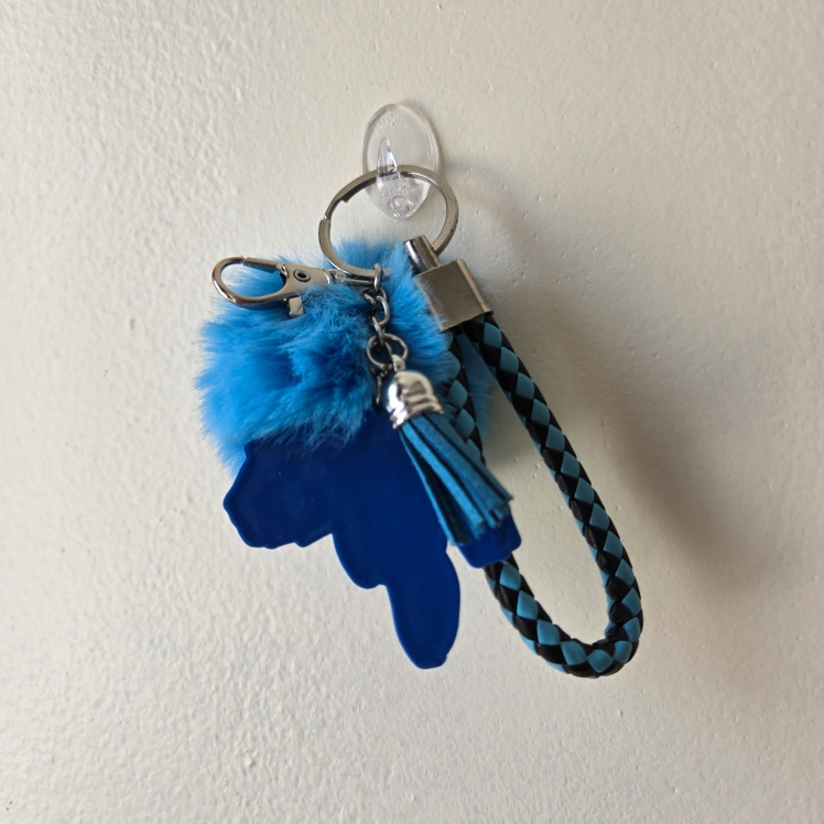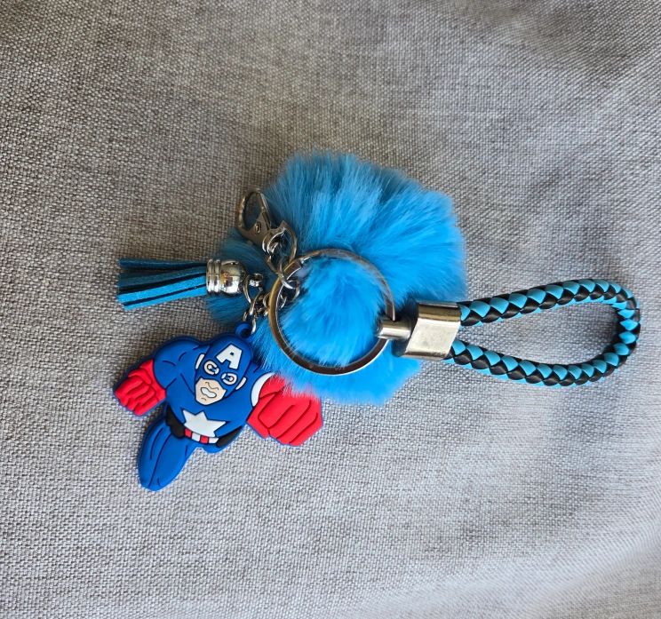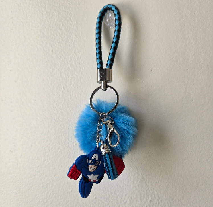 This is a handmade key chain holder with a 3D cute Captain America character from Marvel and features light blue pom-pom detail that adds a soft and playful texture that's hard to resist. It is made of silicone, plastic, and metal materials and features a vibrant, colorful blue and red design. This keychain is not just a statement piece but also a functional accessory that keeps your keys organized. The key chain is a perfect accessory for fans of Marvel and can serve as a fun and practical toy. Proudly made by me personally, this one-size key chain is an ideal gift or a charming addition to your keys or bag.