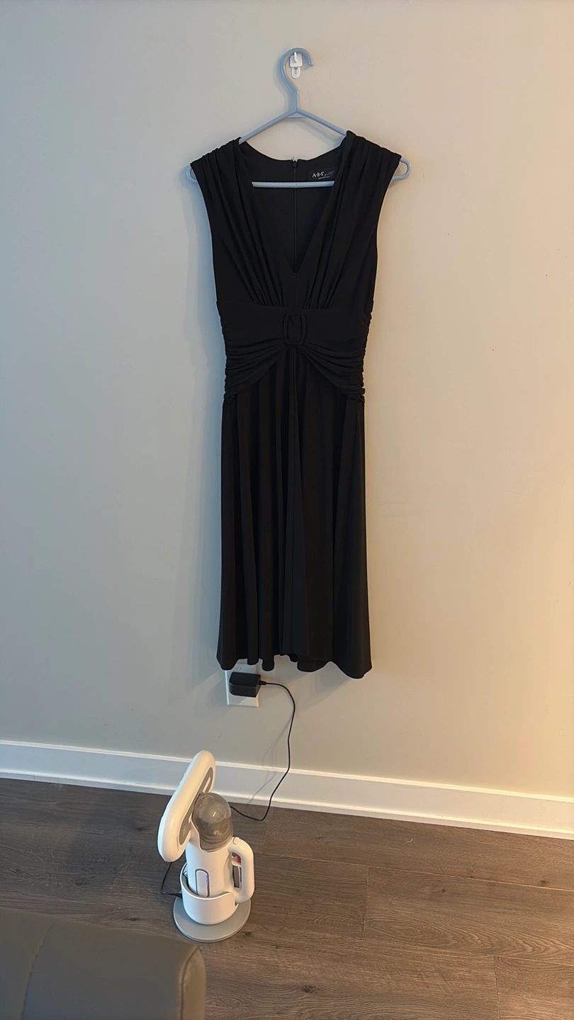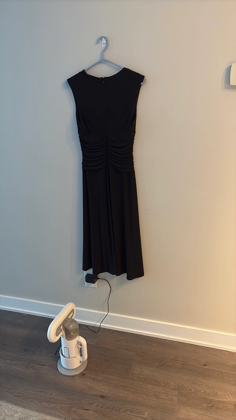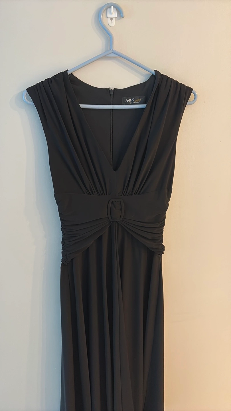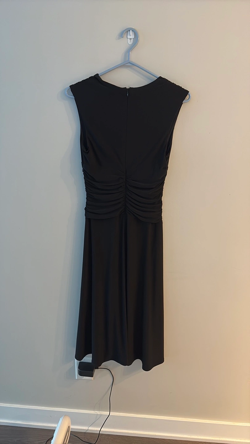 Elegant little black dress. Sleeveless, V-neck, empire waist. Back zipper. Great for special occasions.