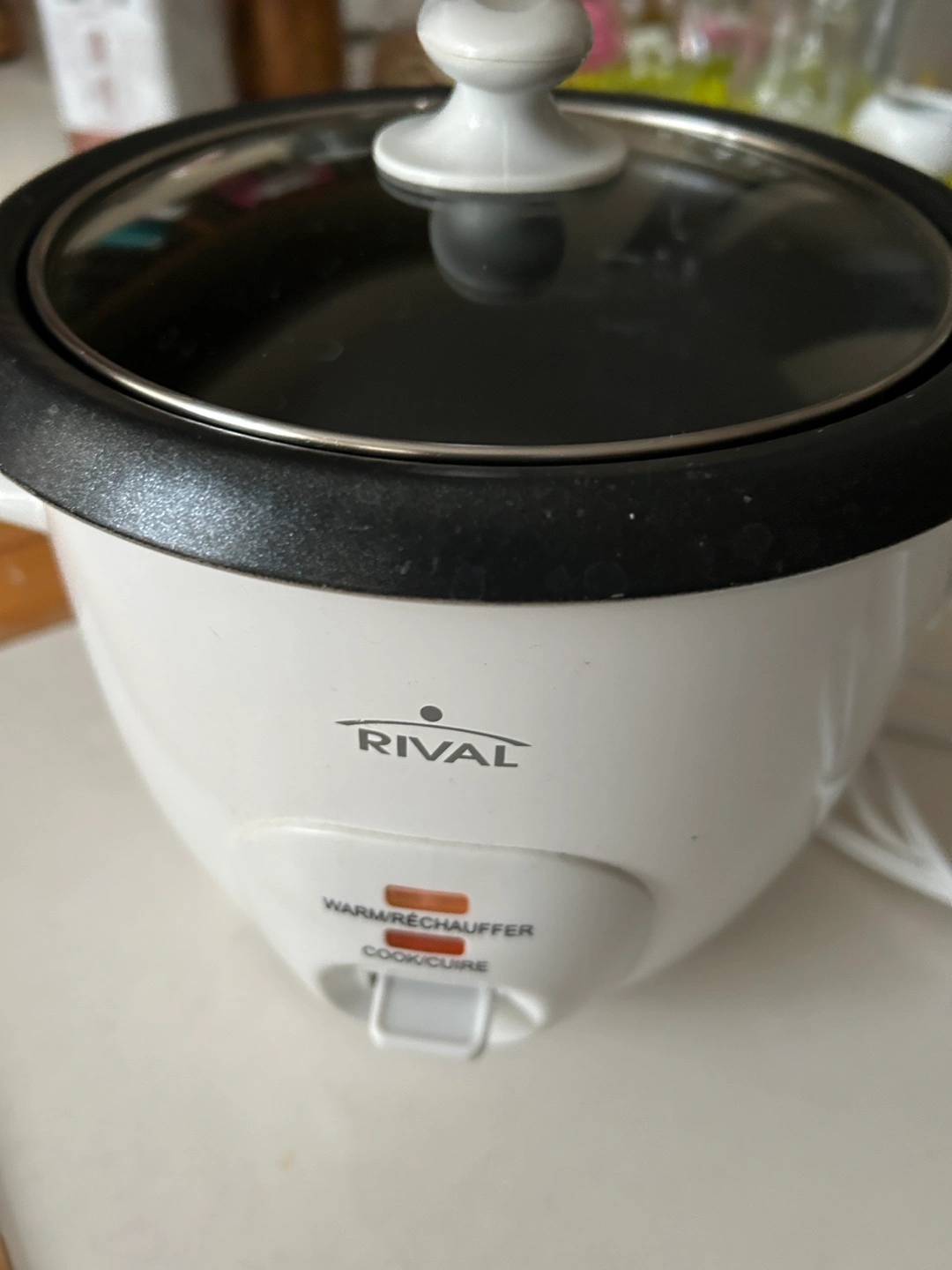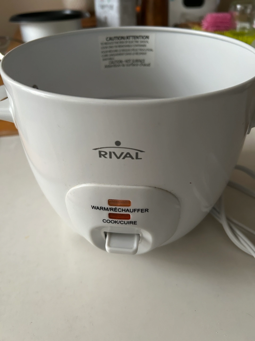 Used Rival rice cooker. White plastic exterior. Non-stick inner cooking pot. Cook and warm settings. Includes new steamer basket not shown.