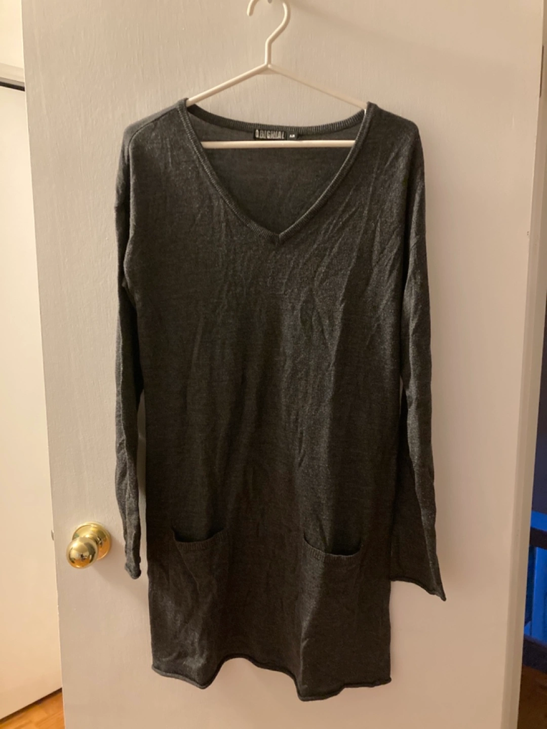 Long sleeve charcoal grey sweater dress. V-neck. Two pockets. Size M. Soft material.