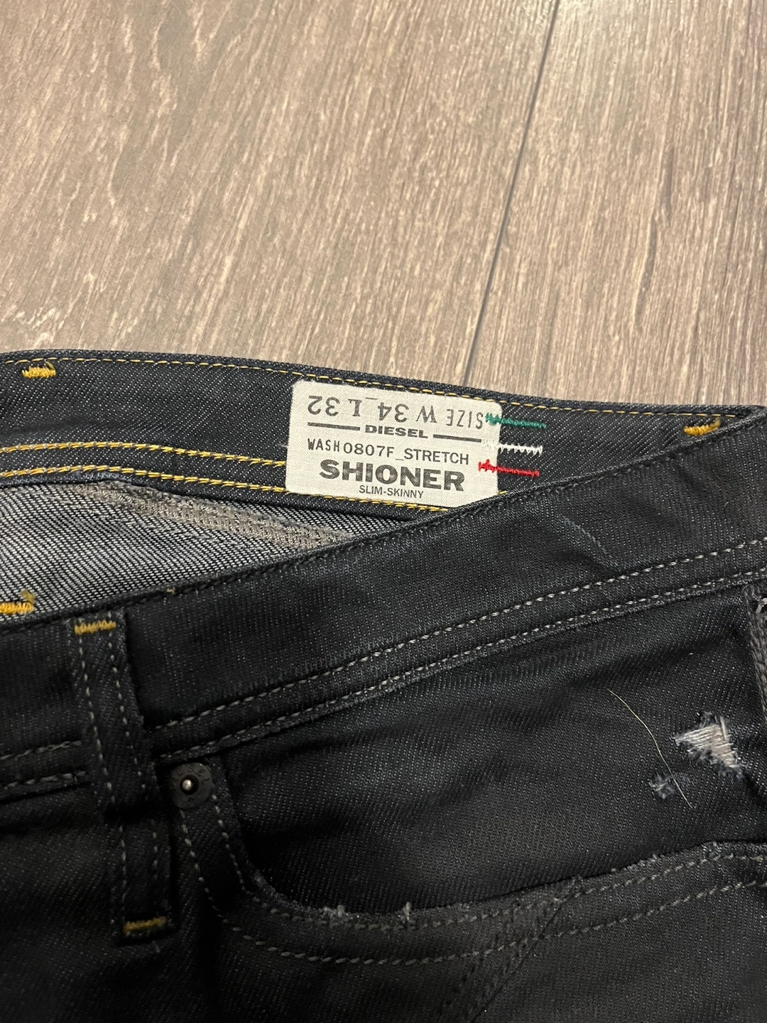 Men's black Diesel Shoner jeans. Limited edition. Size 34/32. Slim fit, with shiny border on legs - great as party wear.
