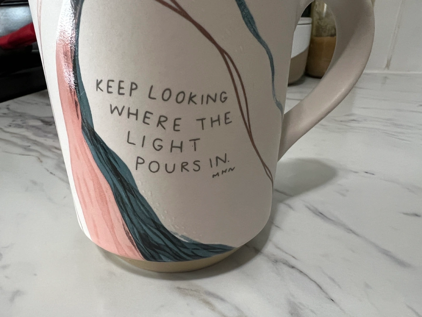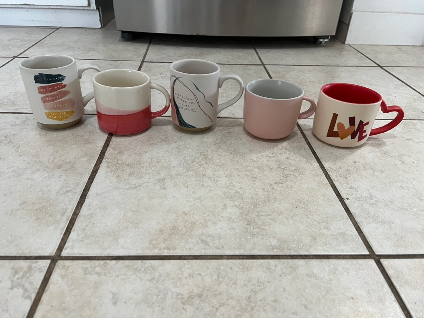 Five mugs, various colours and designs. Unique heart-shaped handles on two. One features a mountain range design, another says 'LOVE'. Perfect for coffee, tea, or hot chocolate. Never used. Bought each one for 12-20 cad plus tax. All for 30 CAD.