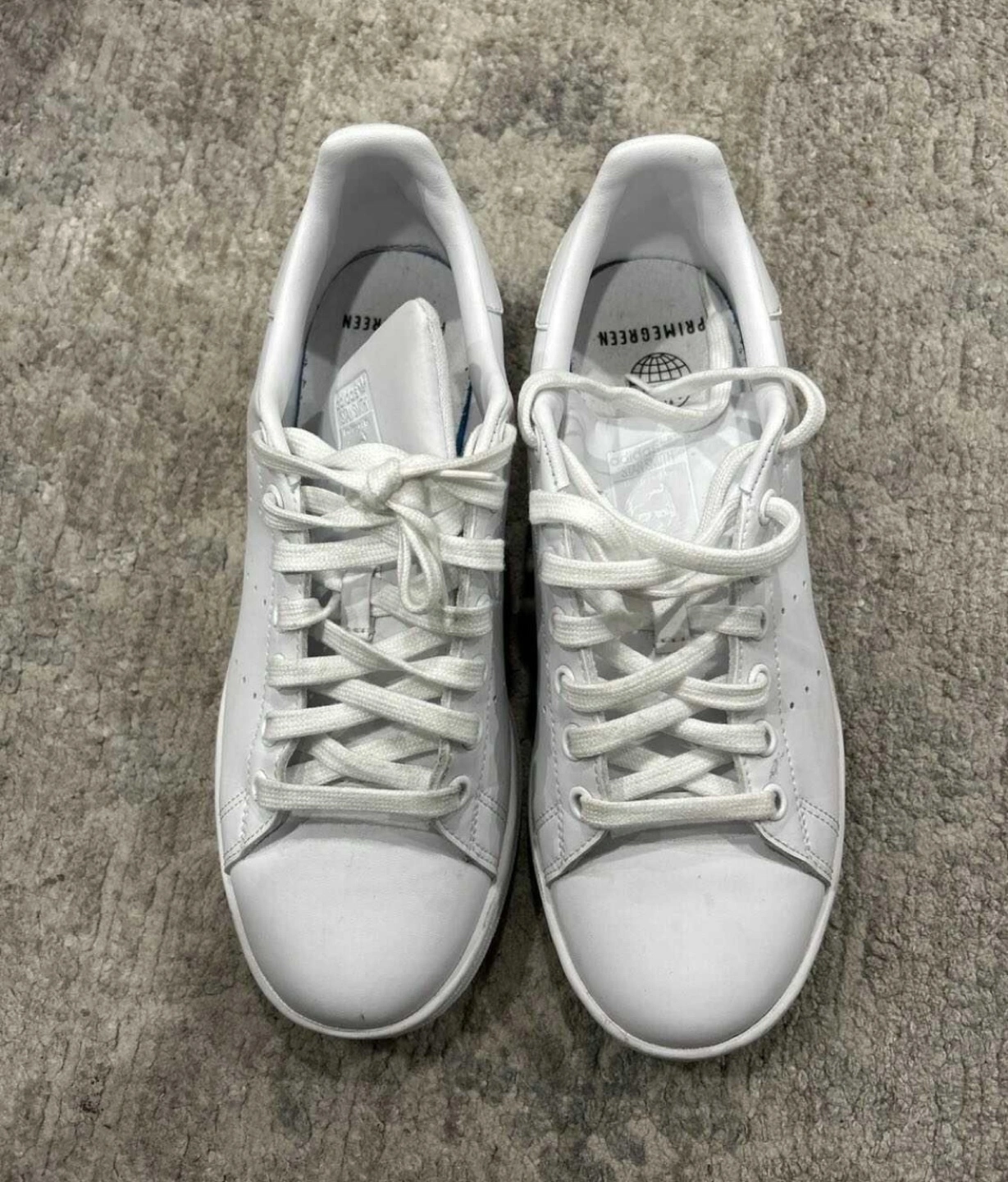 Pair of white leather Adidas Stan Smith sneakers. Primegreen insole.