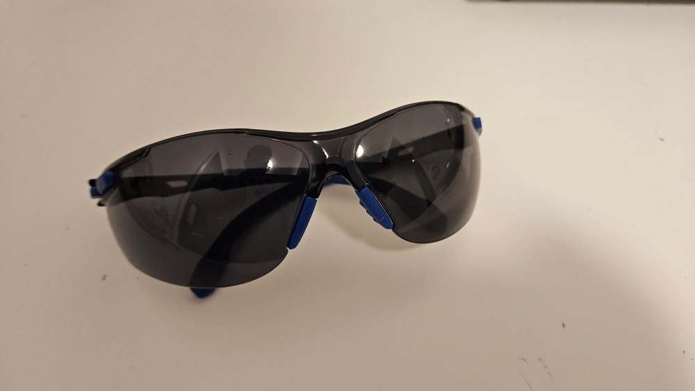 Protective eyewear. Black frames with blue accents. Good for work or other activities requiring eye protection.