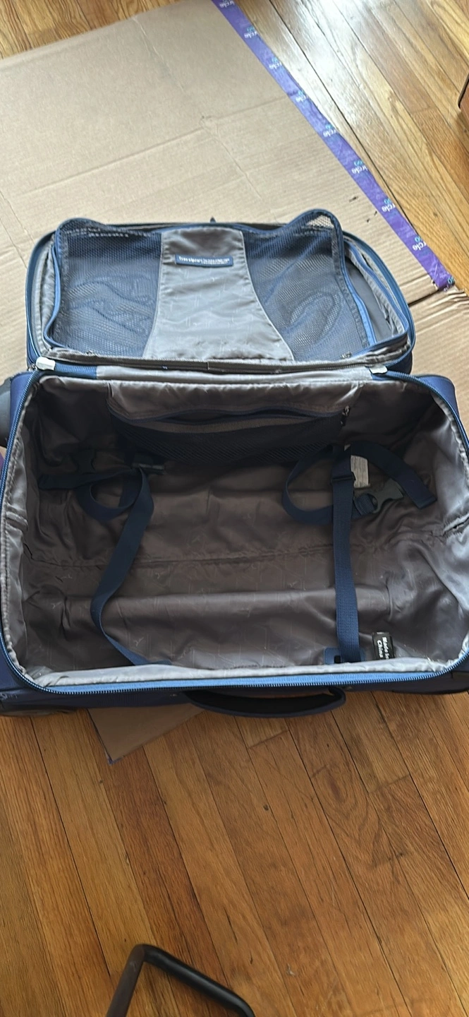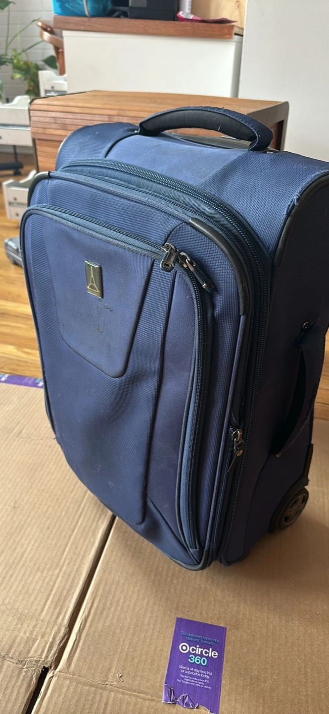Carry-on suitcase, blue, used, several compartments. Wheels and handle 💯 . Some wear and tear but still lots of life