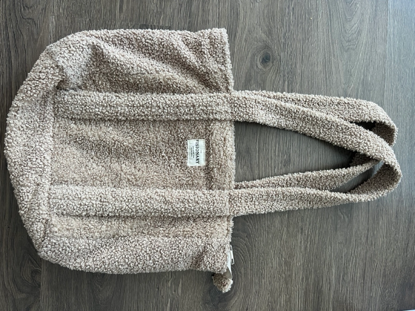 Adorable tan fuzzy tote bag. Features two shoulder straps and a zipper closure. Small interior pocket. Perfect for everyday use. Zipper works perfectly.