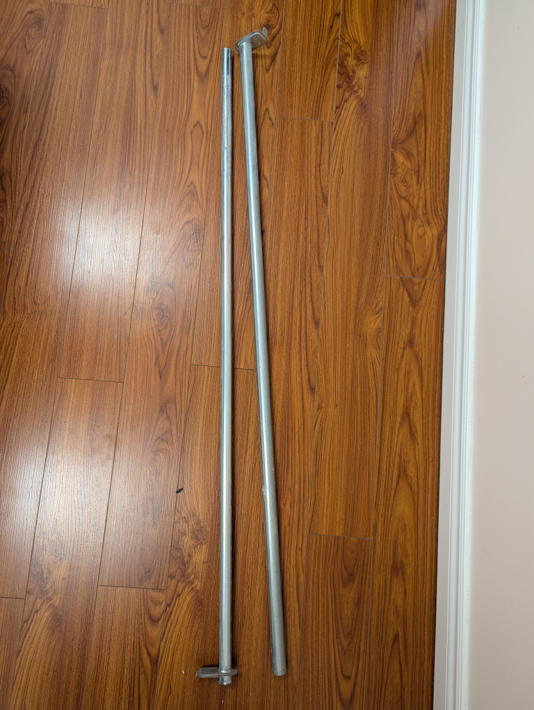Long, metal closet rods. Each rod features a small end cap. Two available. Can be used in closets for hanging jackets and clothing.