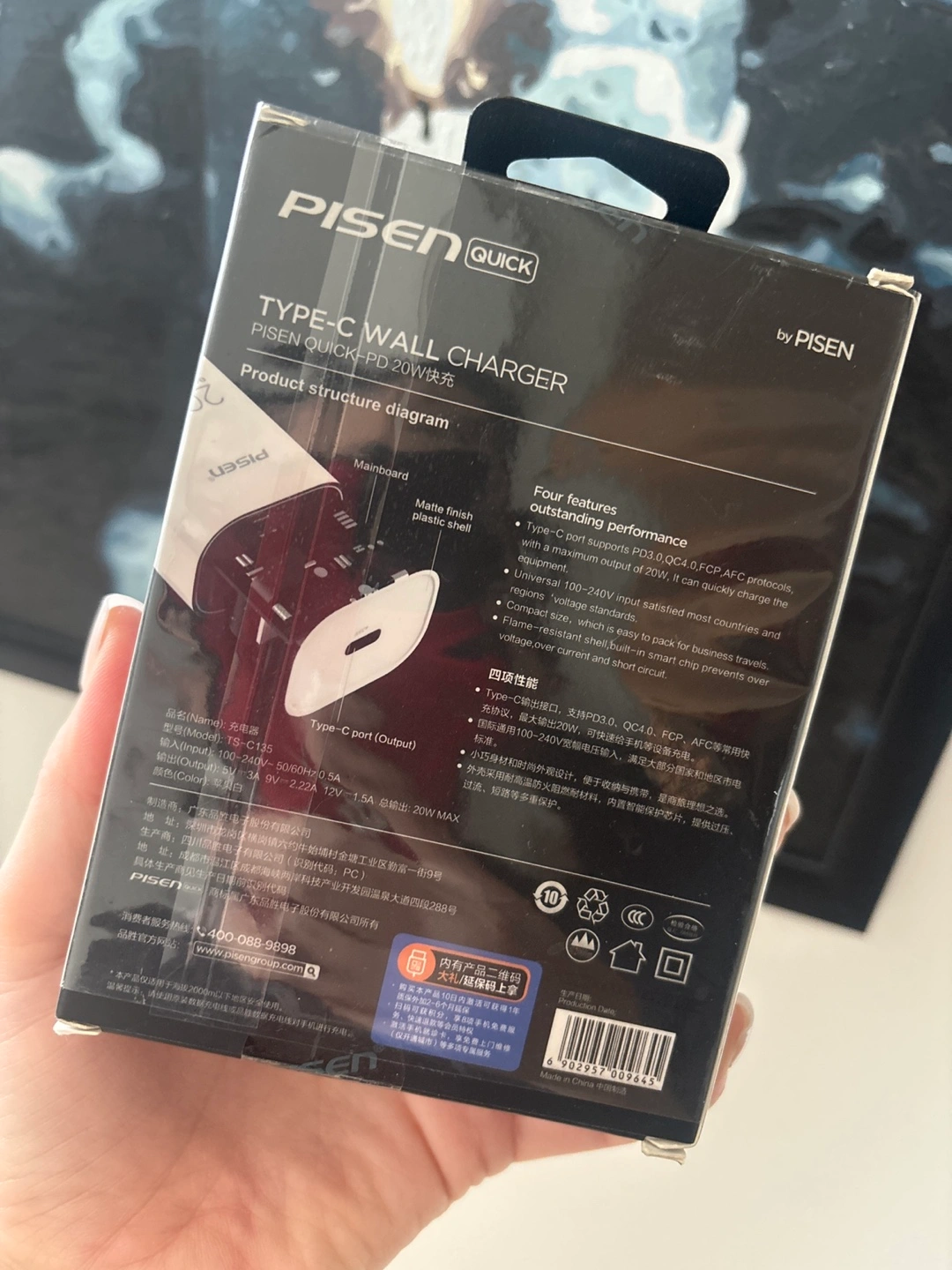 Portable and compact 20W Type-C wall charger. Features fast charging protocol. Includes multiple safety features. Suitable for mobile phones and tablets.