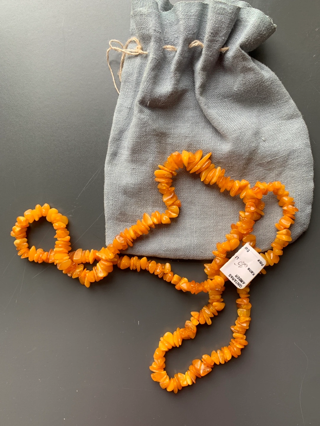 Genuine amber necklace. Irregularly shaped amber beads. Comes in a gray drawstring bag. Approximately 26 inches long. No clasp. Authentic from Estonia