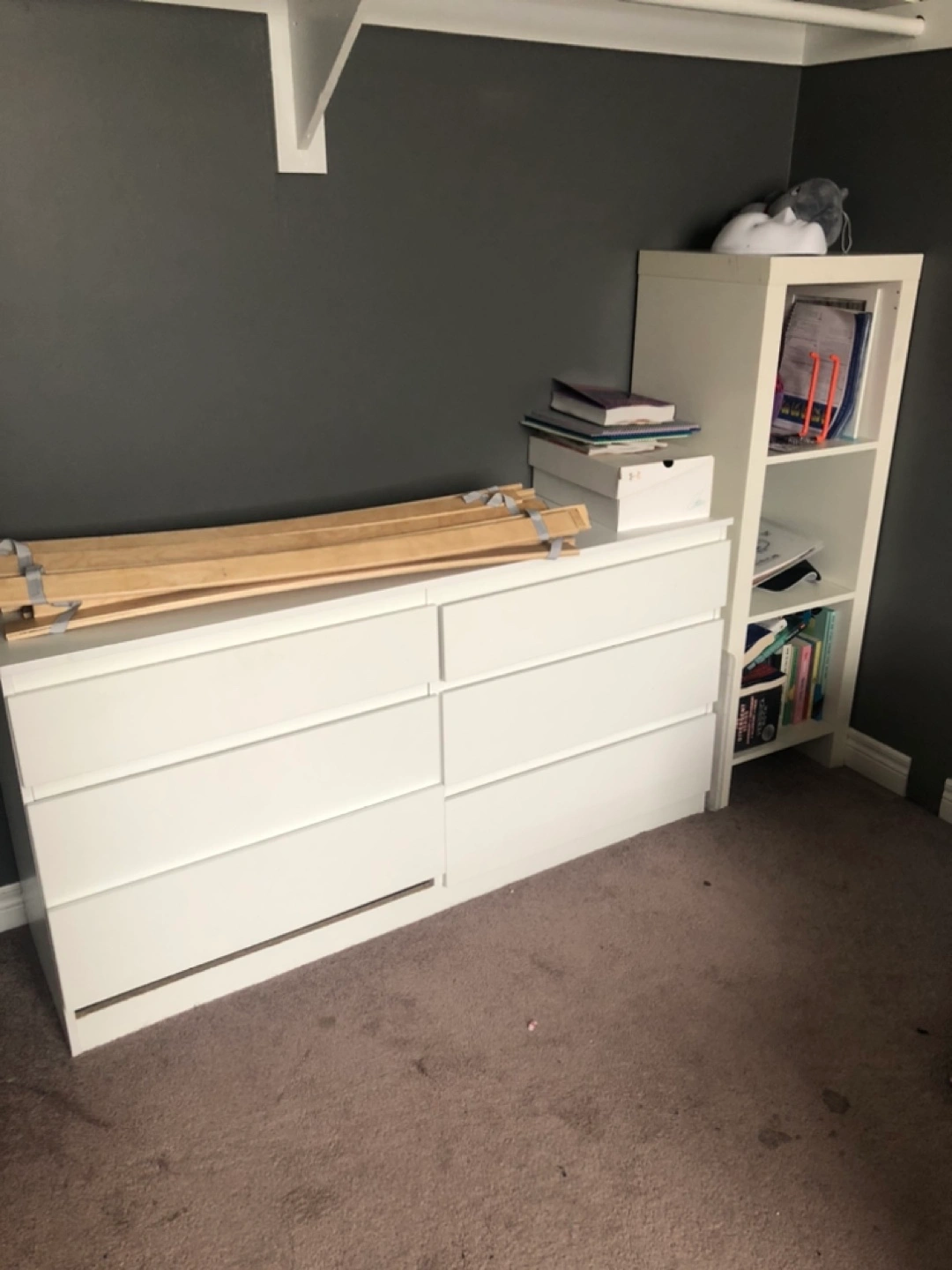 White HEMNES single bed frame, nightstand, and six-drawer dresser. Minimal assembly required. Some minor wear and tear. Great for a child's