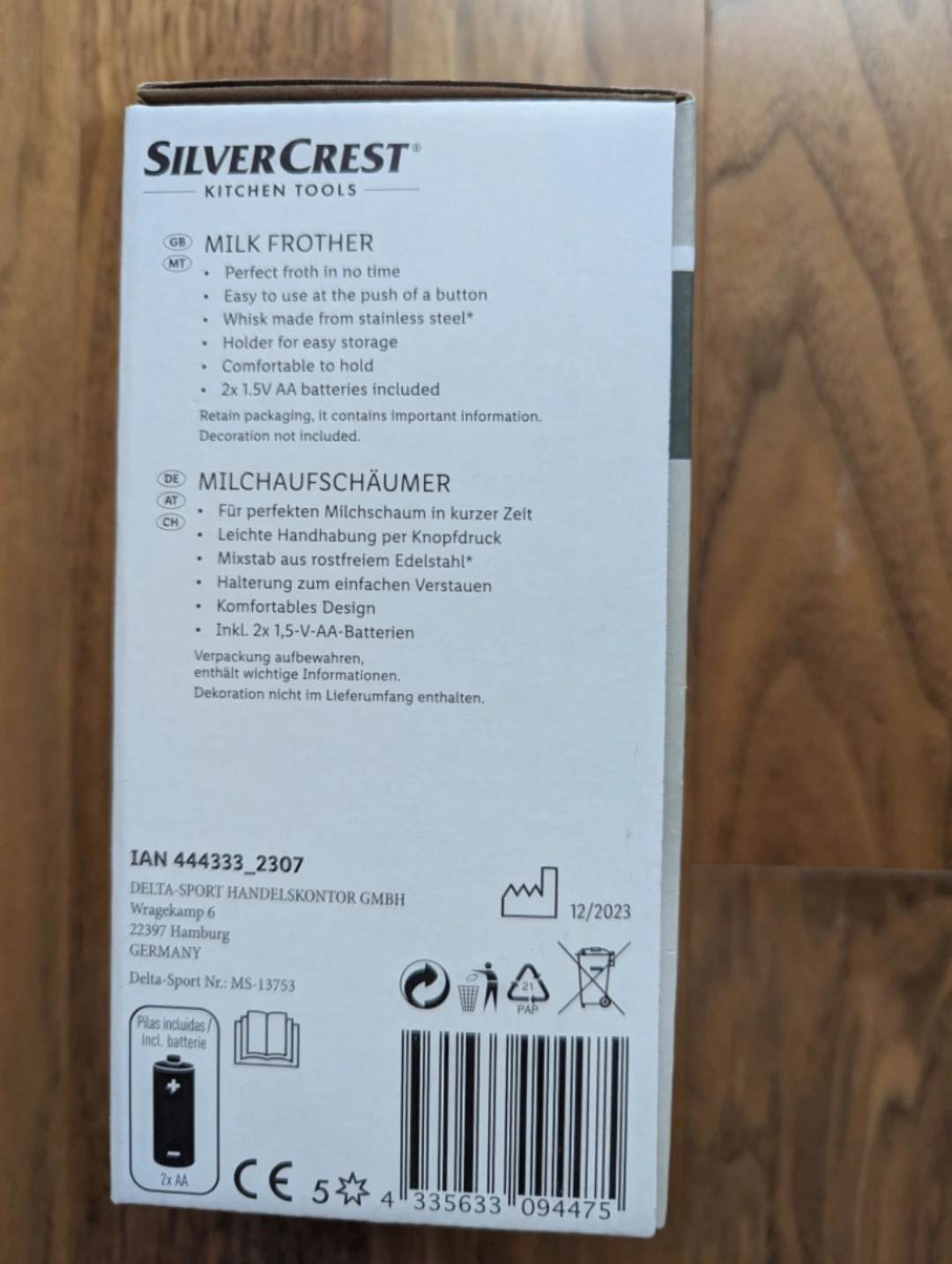 Brand new, in sealed box SilverCrest milk frother. Perfect froth in no time. Easy to use. Whisk made from stainless steel. Comfortable ergonomic design. Includes stand and 2x 1.5V AA batteries.
