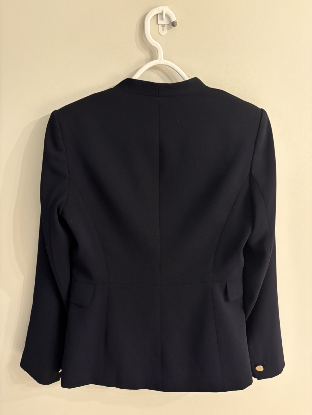Women's navy blazer. Gold toned hardware. Long sleeves. Open front.