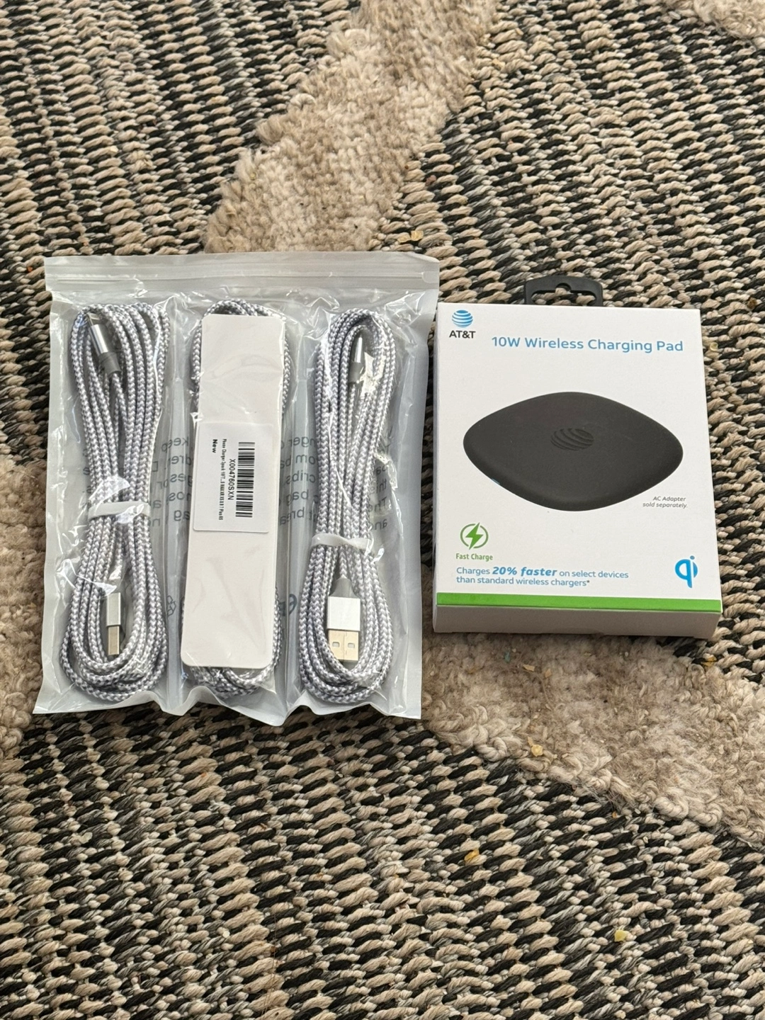 New AT&T 10W wireless charging pad. Includes three 10ft phone chargers. Compatible with select iPhone models. Fast charging.