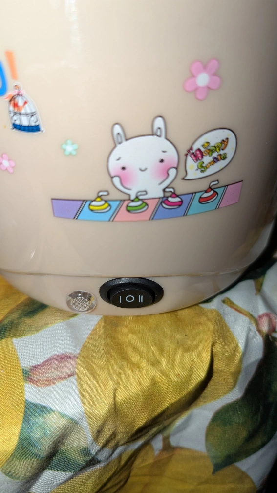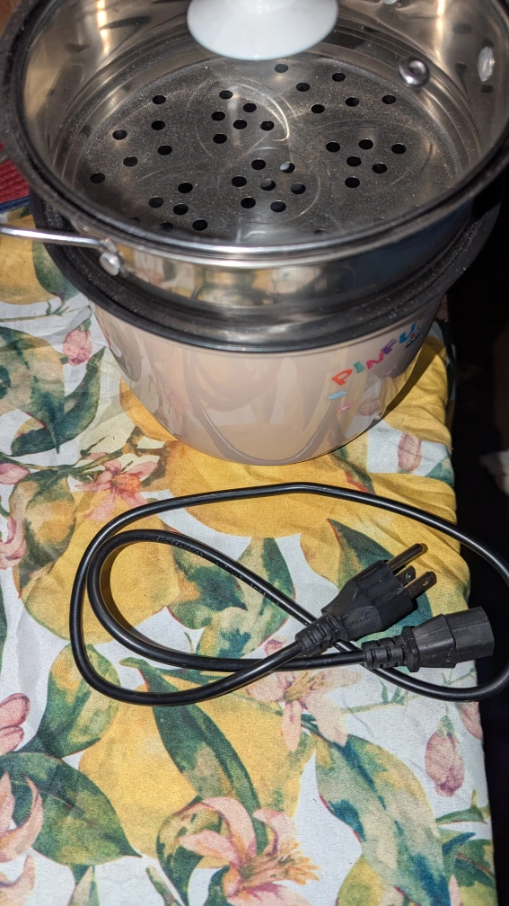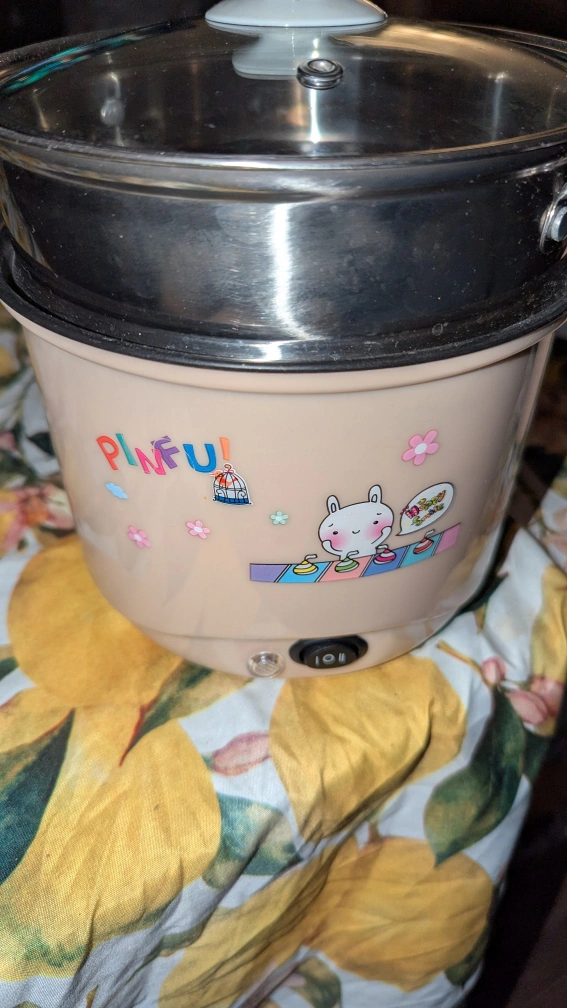 Adorable Pinkfu electric multi-cooker. Includes a steamer basket and glass lid. Features a cute bunny design. Great for small kitchens or single servings. Power cord included.