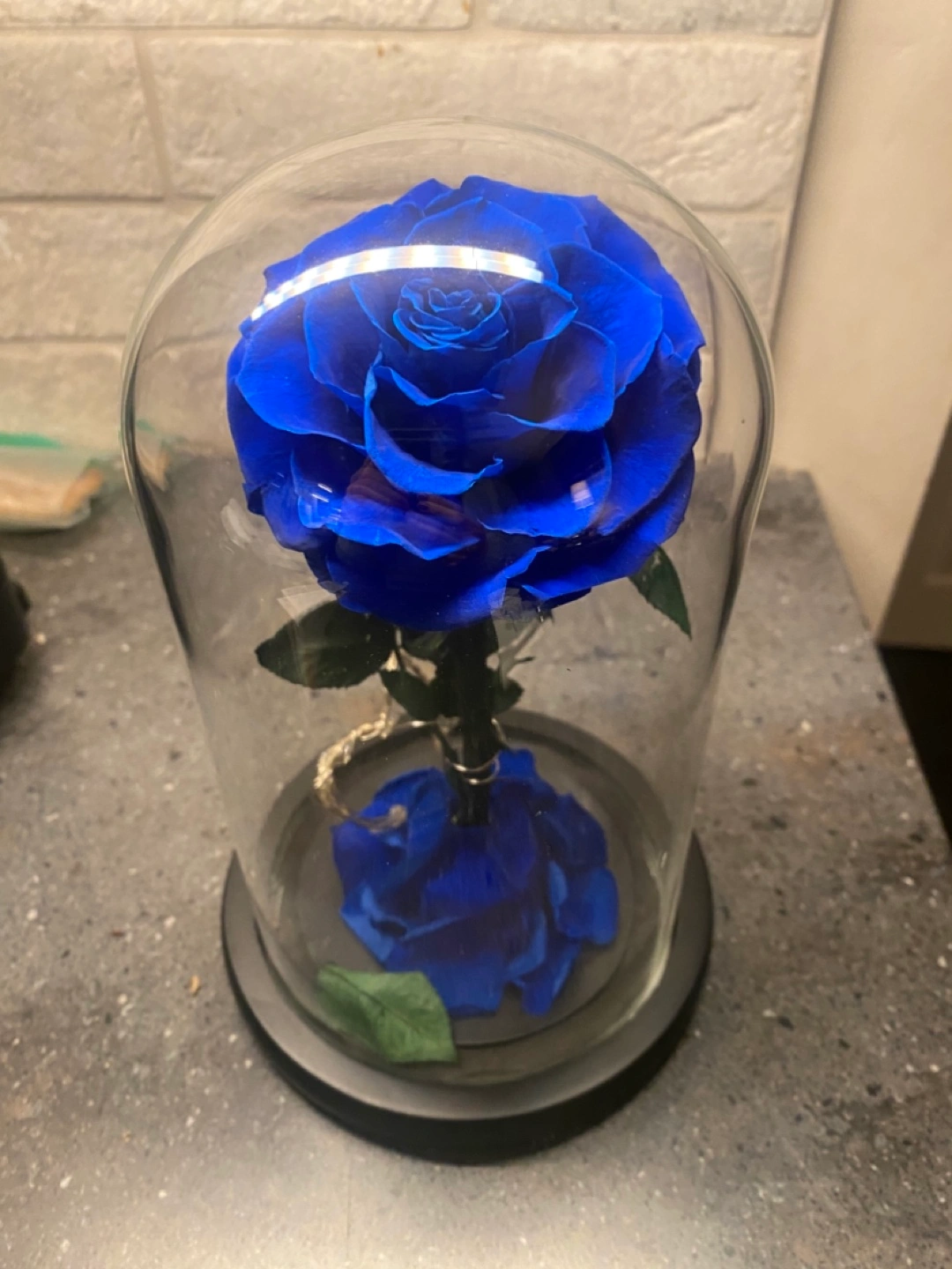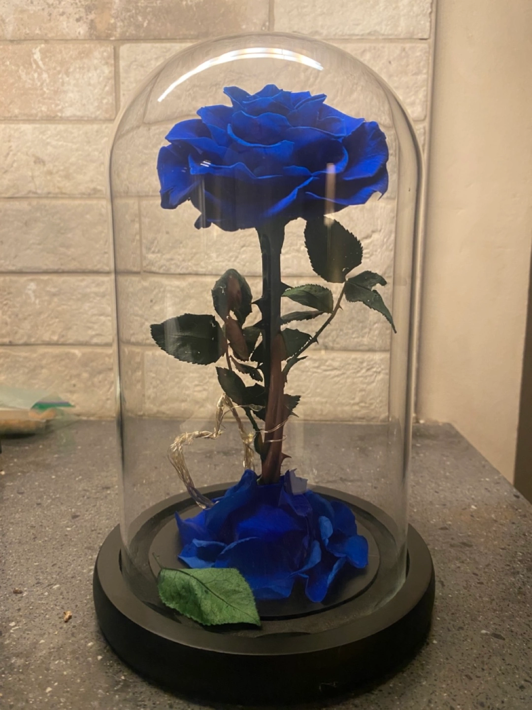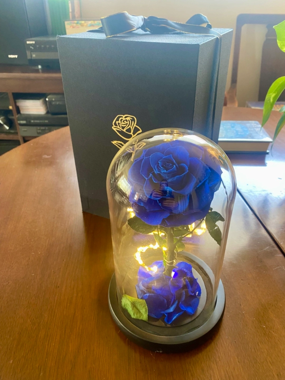 Beautiful blue preserved rose, encased in a glass dome. Features LED lights. Includes a nice black gift box. Perfect gift.