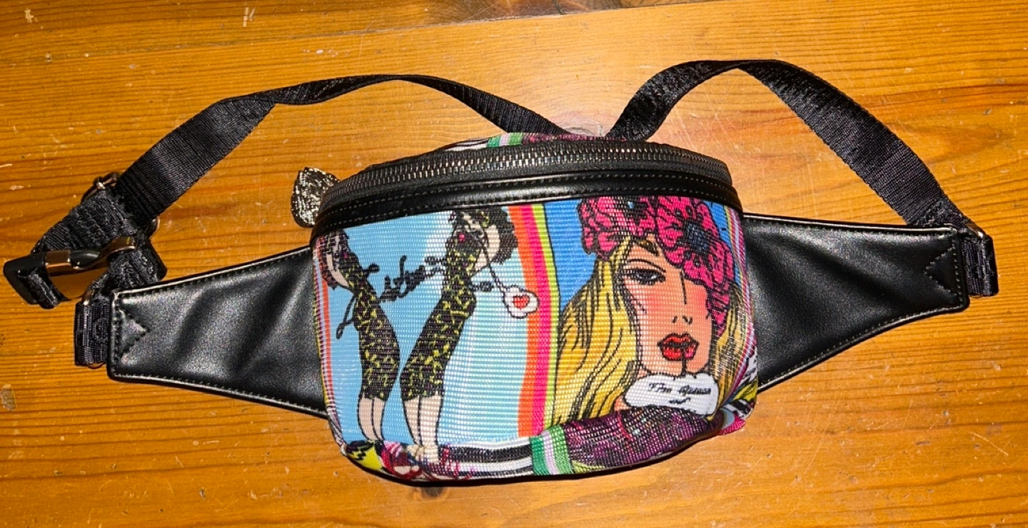 Small, colorful fanny/waist pack from Betsey Johnson. Adjustable strap. Zip closure. Can hold a phone and other important stuff! Comic-style print. NEW