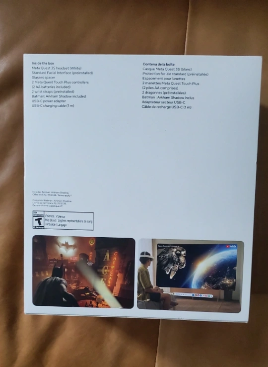 New Meta Quest 3S virtual reality headset. 128GB storage. Includes Batman Arkham Shadow game. Comes with controllers and charging cable. Brand new in box. Unopened.