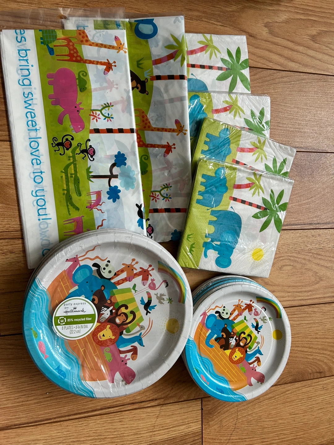 2 table cloths, 4 napkins packages (16/per pack), 3 small plates packages (8 per pack), 5 large plates packages (8 per pack). Additional 2 table cloths available for $1 each. All new.