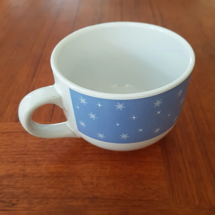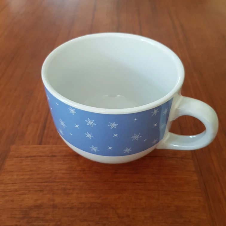 A soup bowl that features a blue band with snowflakes. The other cup is there only as a reference for size.