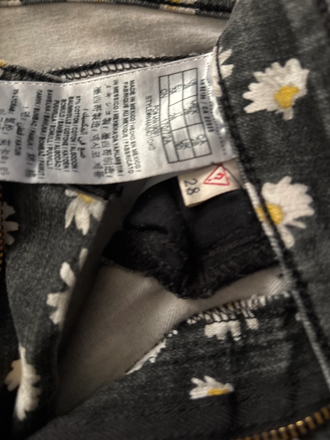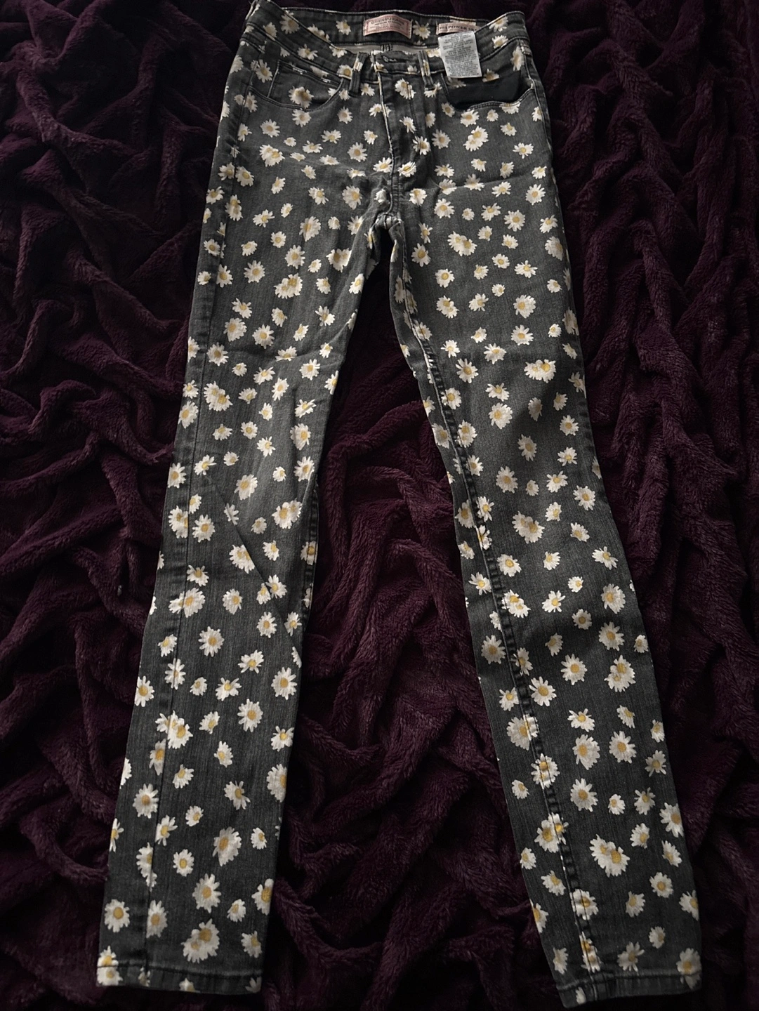 Dark grey skinny jeans. All-over daisy print. Size 28. Excellent condition.