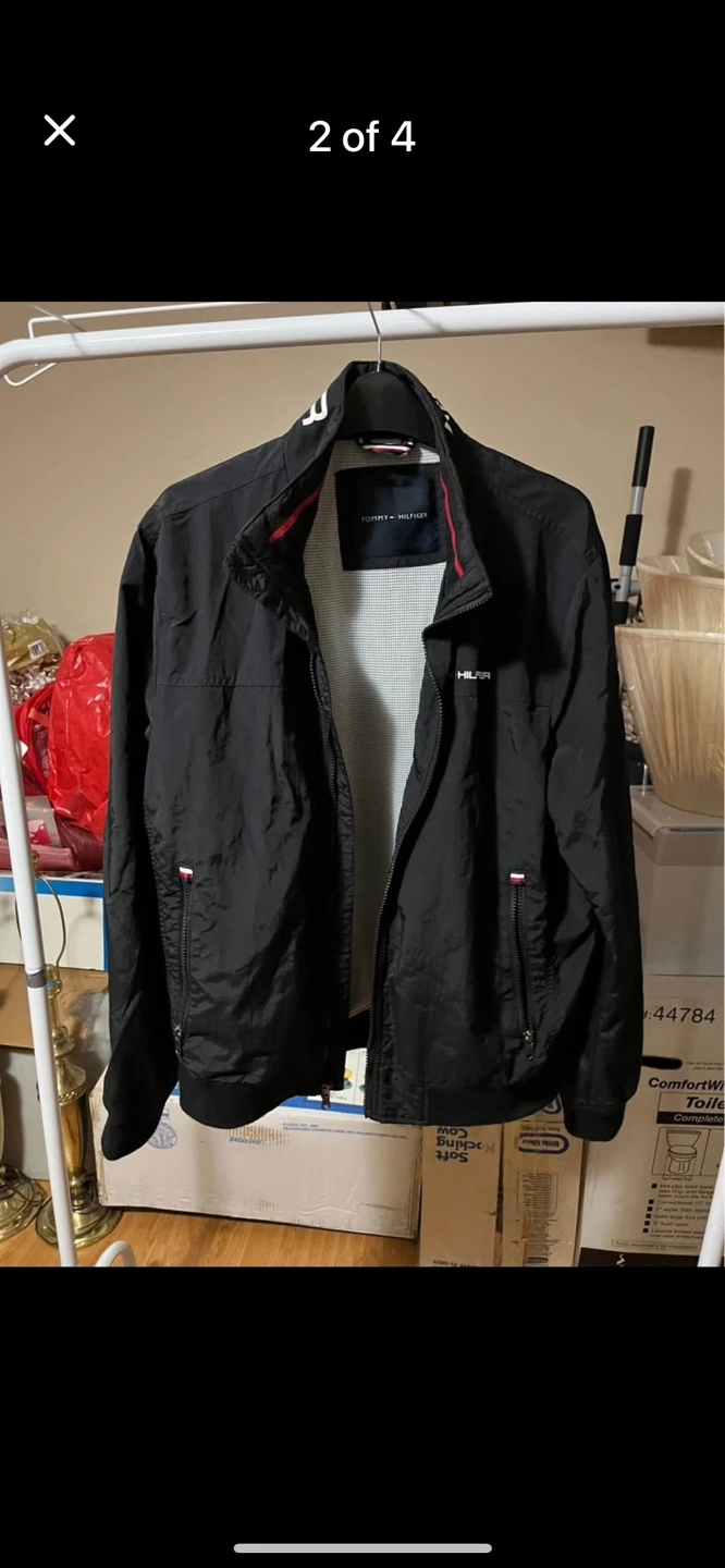 Men's black jacket. Full zip closure. Features a ribbed collar. Pockets. Lightweight.