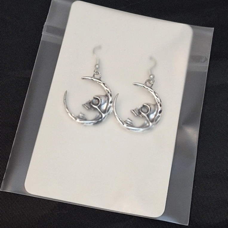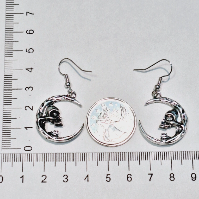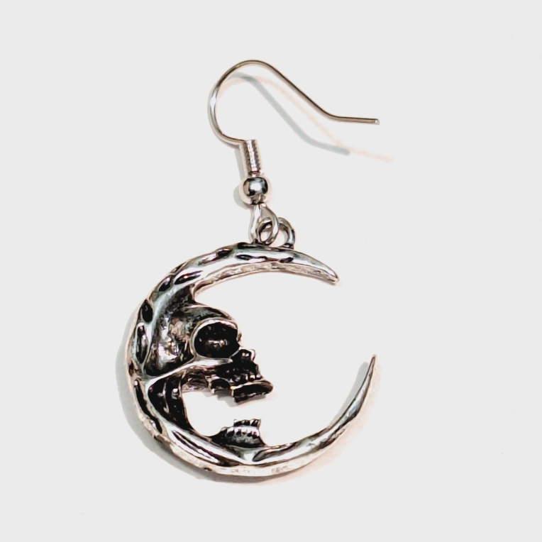 Silver tone metal earrings. Crescent moon design features a skull. Unique gothic style. Lightweight and easy to wear.