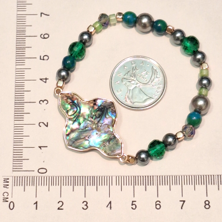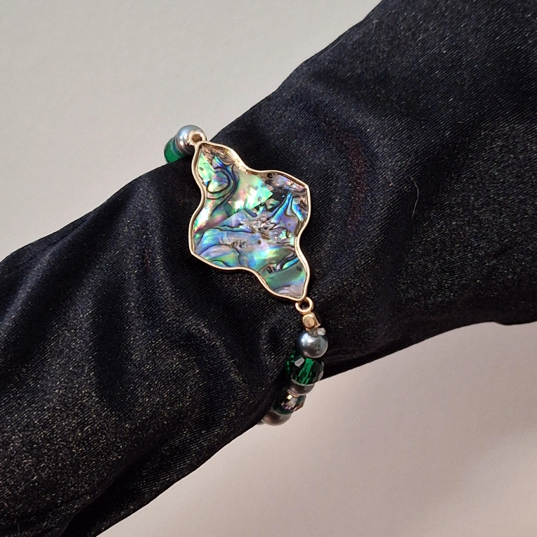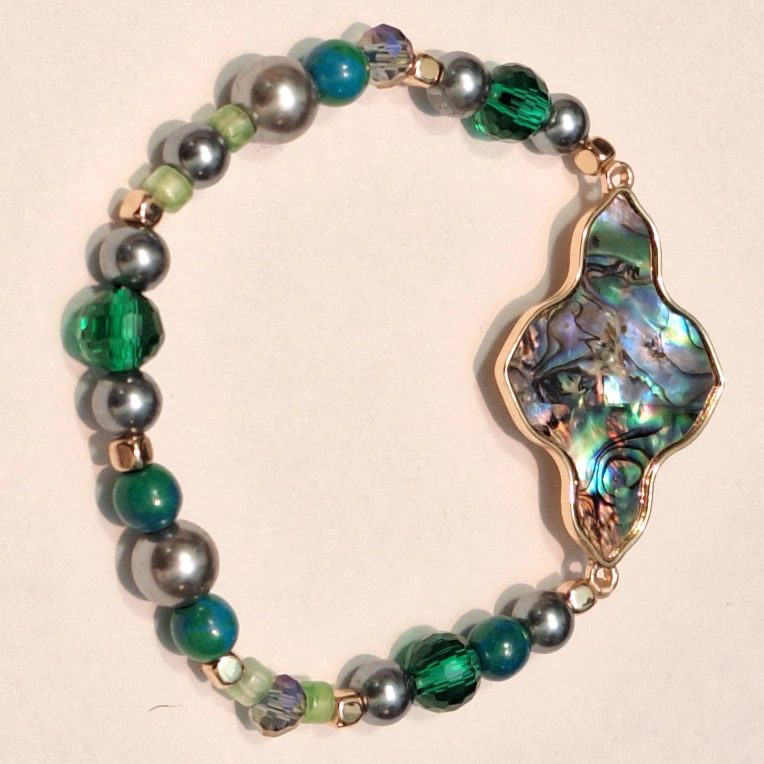 Elegant bracelet featuring a unique mother-of-pearl focal piece. Green and grey beads, gold accents. Stretchy band. Perfect for adding a touch of elegance to any outfit.