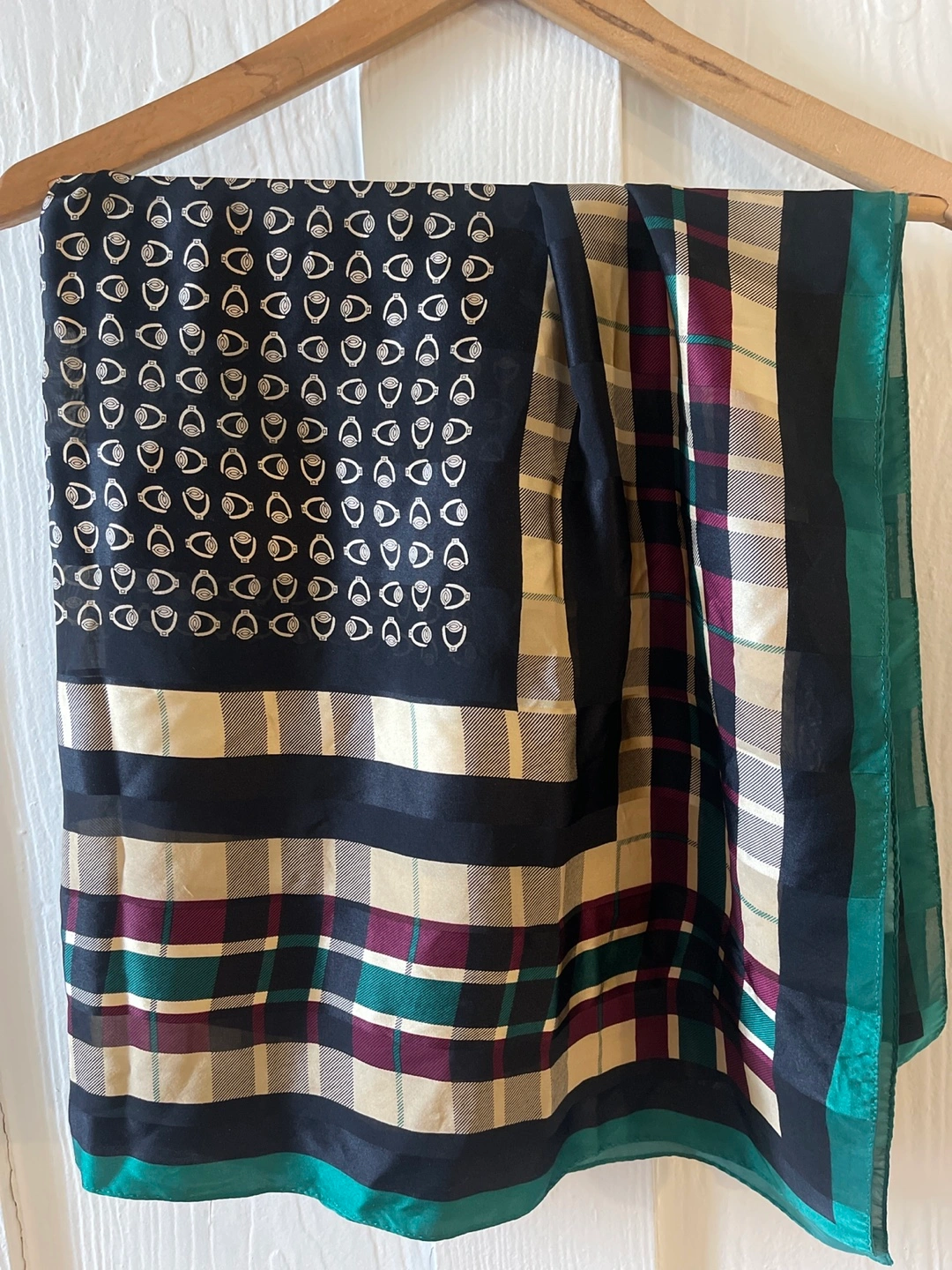 Beautiful vintage silk scarf. Features a unique plaid pattern and a repeating nutcracker design. 100% silk.