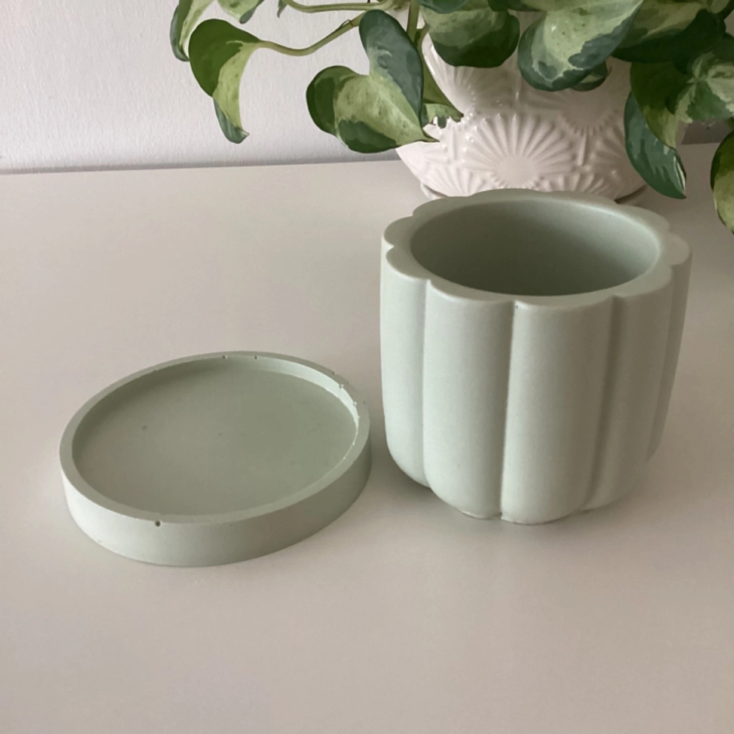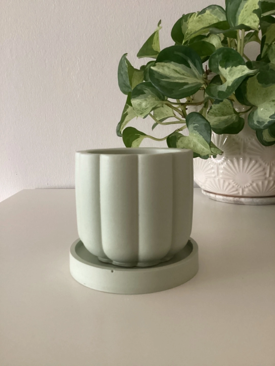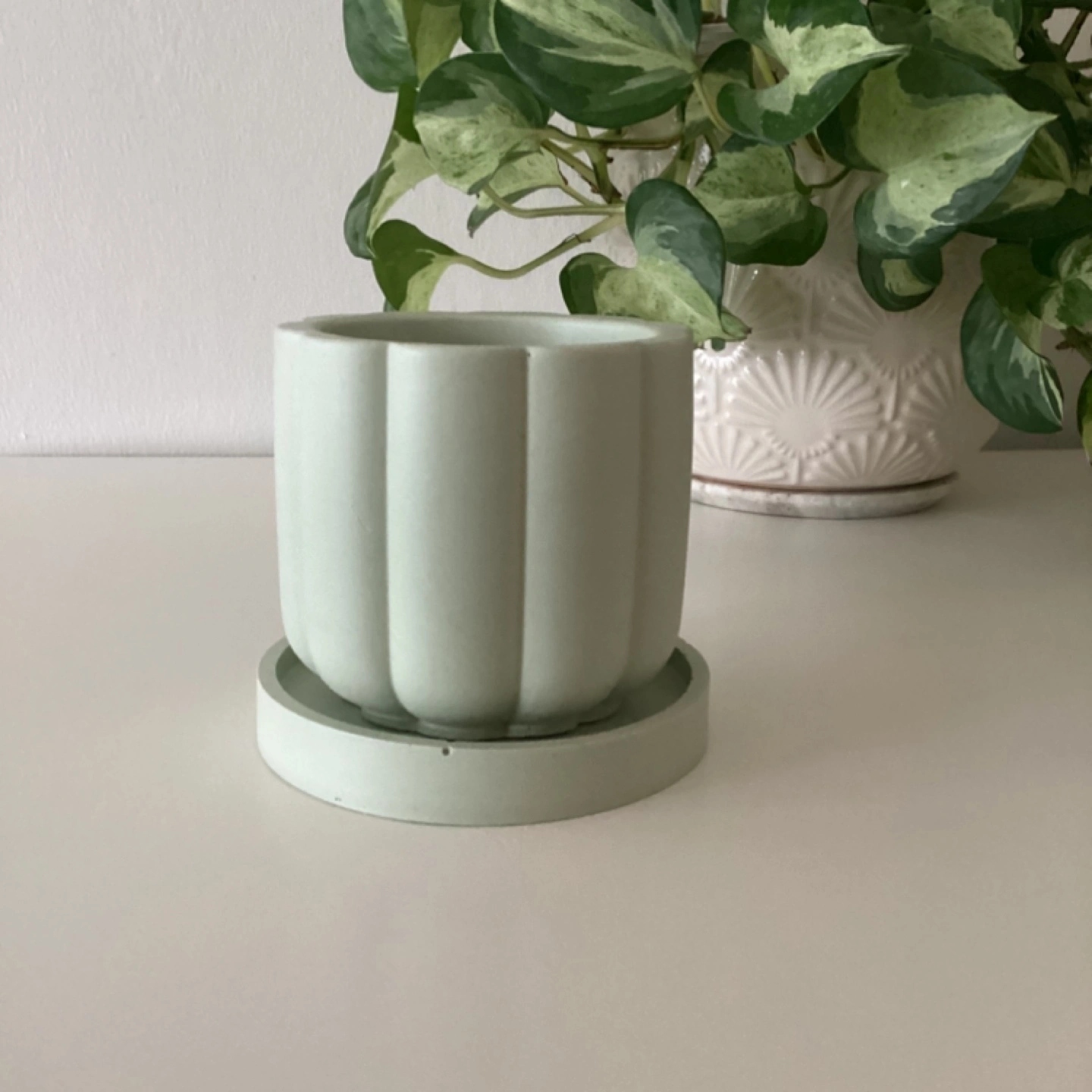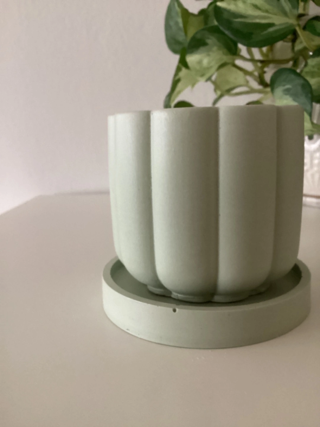 Handmade (by me) Sage Green Jesmonite planter. Cute little planter, perfect for succulents or small plants. Features a ribbed design and matching saucer. Drainage hole at the bottom. 3β diameter.